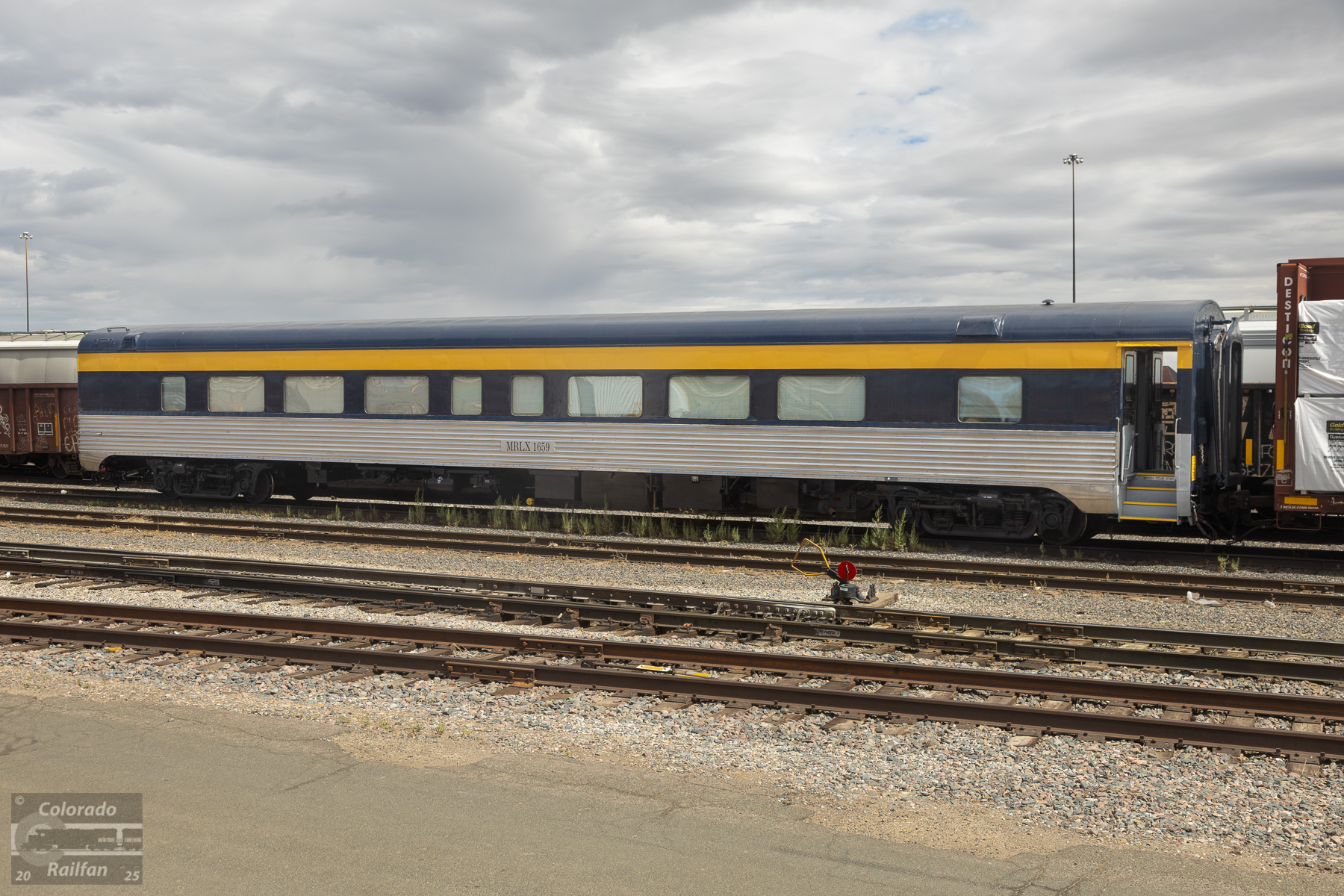 A close up shot of MRLX 1659 sitting in North Yard. The car was originally built in 1950 by Pullman-Standard for the Chesapeake & Ohio Railway. The C&O ordered 284 streamlined cars from Pullman-Standard in 1946 (later reduced to 185 cars), and this was part of that order. After the C&O, the car spent time on the rosters of the Seaboard Coast Line, Chicago & North Western, Southern Pacific, and Nacionales de Mexico, before landing on the roster of Mid America Rail Car Leasing. It is rumored that it is now headed for a museum in Illinois.
