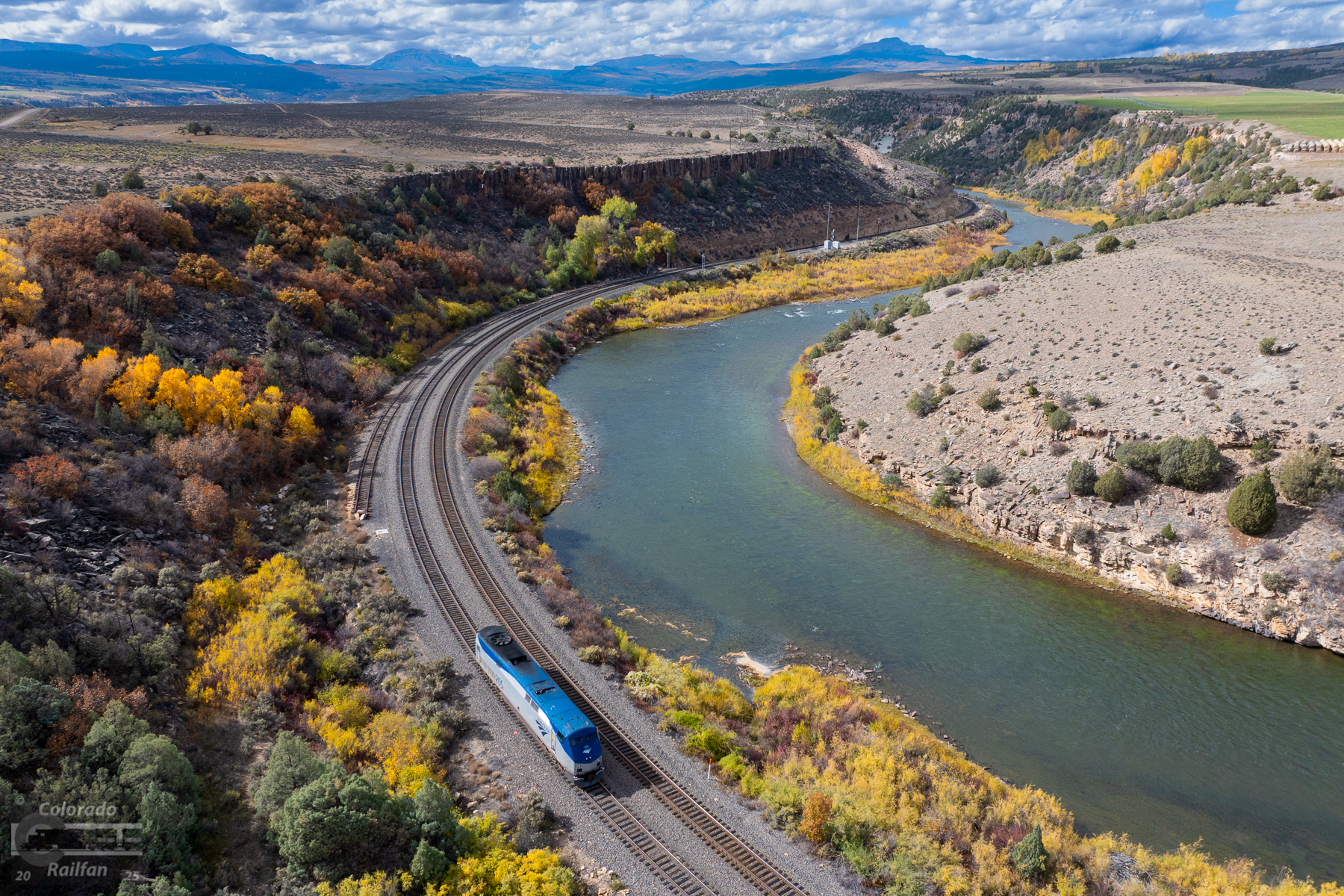Now here is something I definitely did not expect to find in the siding at Dell! A single Amtrak P42DC. Unfortunately, the eastbound Zephyr the day before struck a vehicle not far west of here on the Dotsero Cutoff. For safety reasons, the unit was set out here in the siding at Dell.