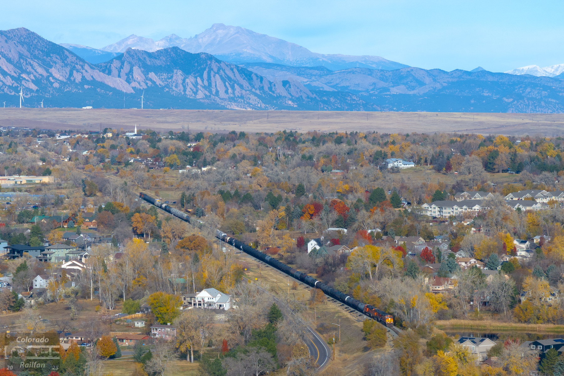 Most of the fall colors have faded to fairly dull colors and leafless trees in Arvada as BNSF's Provo-Denver rolls eastbound out of Leyden. A mild fall with no appreciable snow has resulted in a still-bare Long's Peak off in the distance.