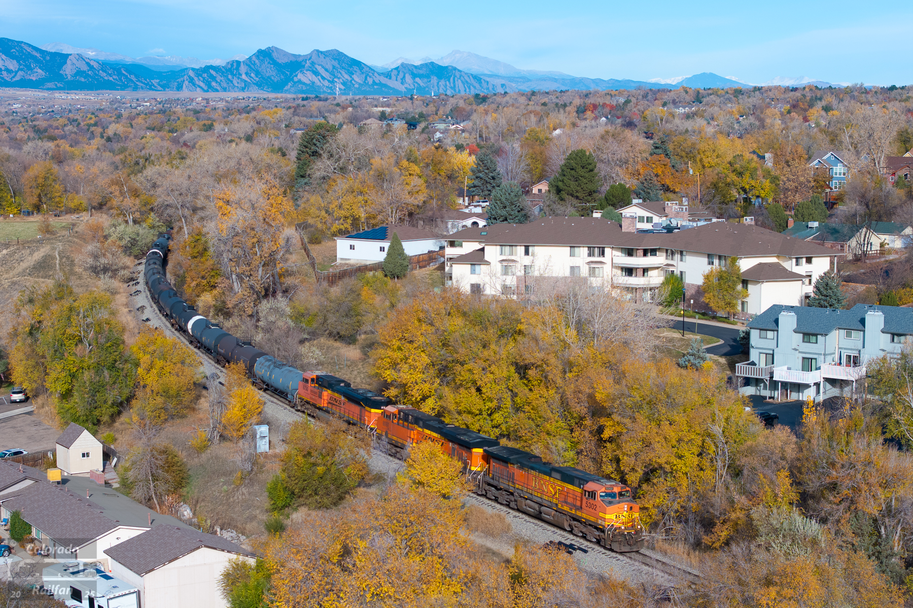 Three units lead BNSF's Provo-Denver, per the usual, as it wraps through the S-Curve in the middle of Arvada, just east of 66th Avenue. Despite it being early November and there being a lot of windy days this week, a lot of trees still have their leaves here.