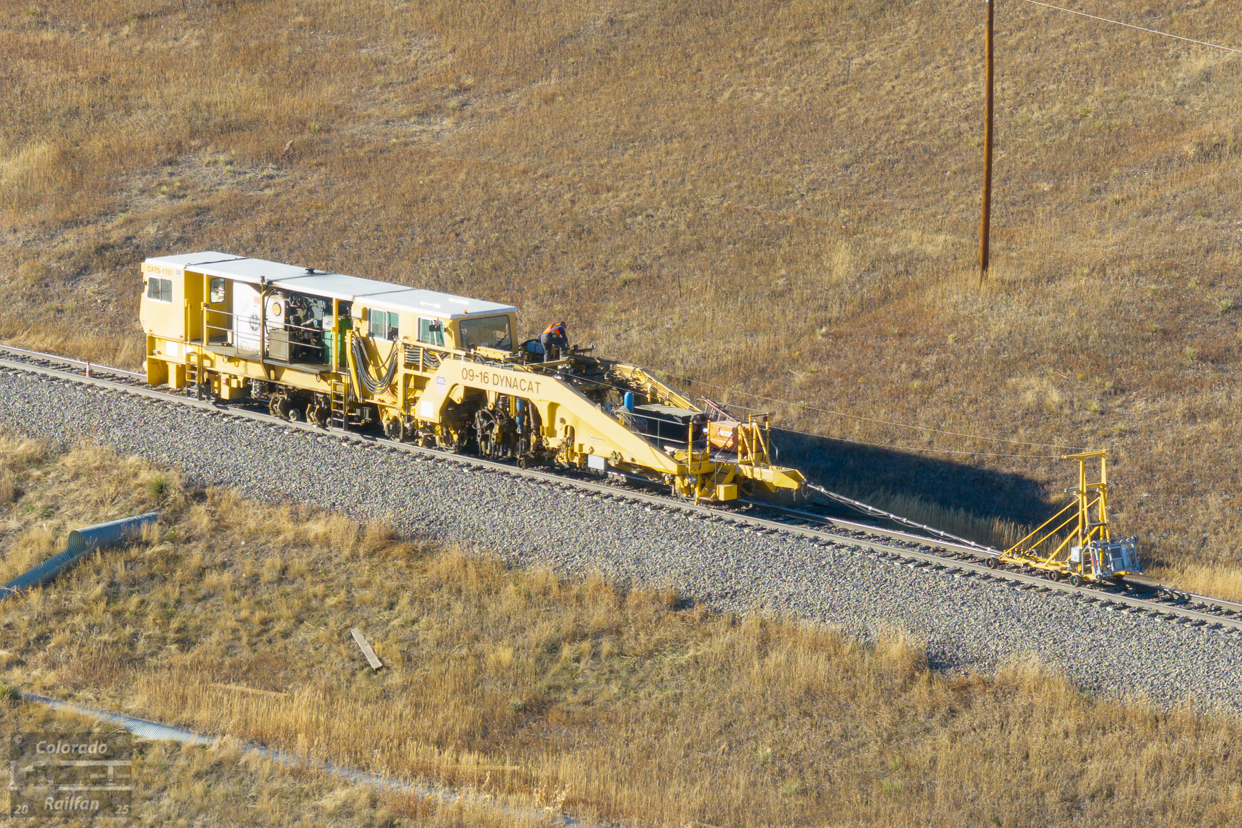 This machine is a continuous-action surfacing tamper. It lifts, lines, and tamps the track, as well as dynamically stabilizes the rails so that trains can safely run at track speed over the track. This is the final piece of equipment in the tie gang.