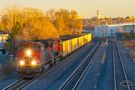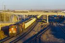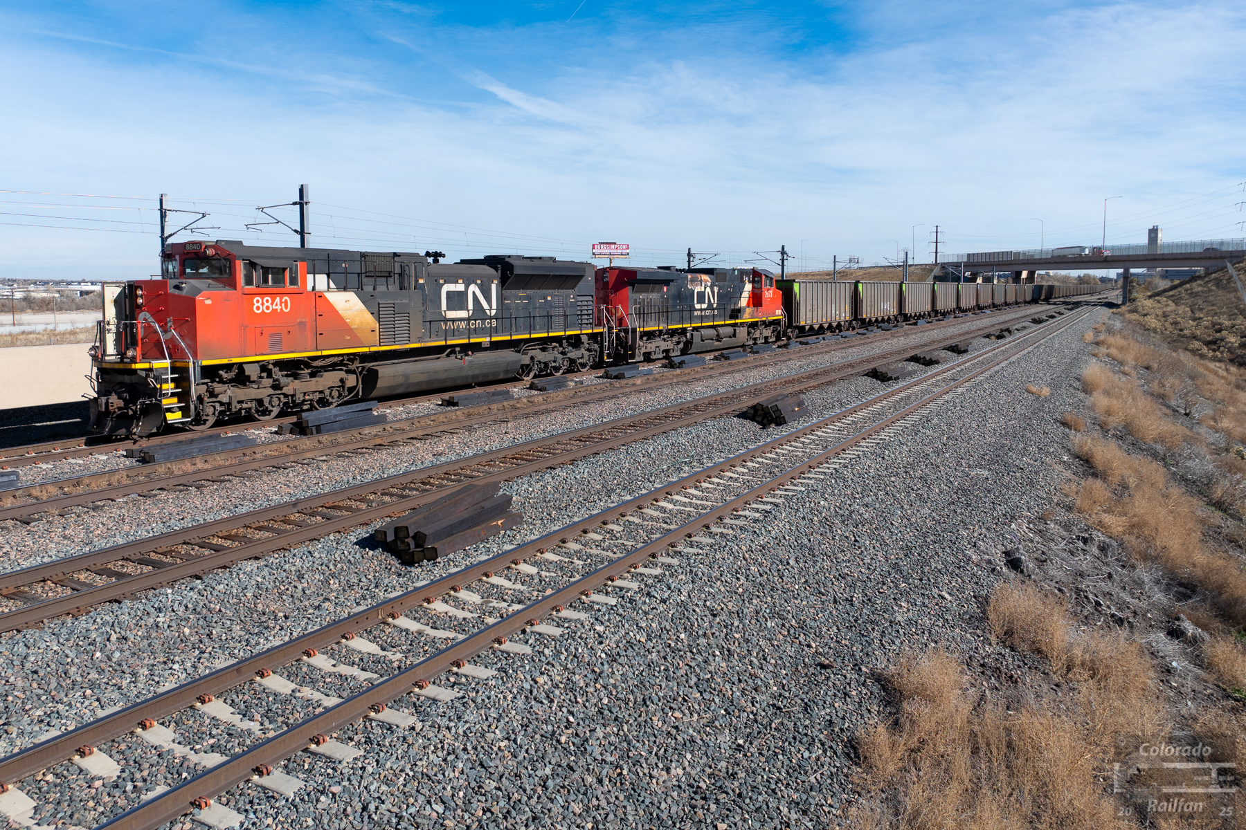 A pair of CN units on a westbound UP coal empty are slowing to a stop on Bypass 1 near the RTD station at Federal, just east of the signals at C&S Junction. Piles of ties await a tie gang to get them installed.