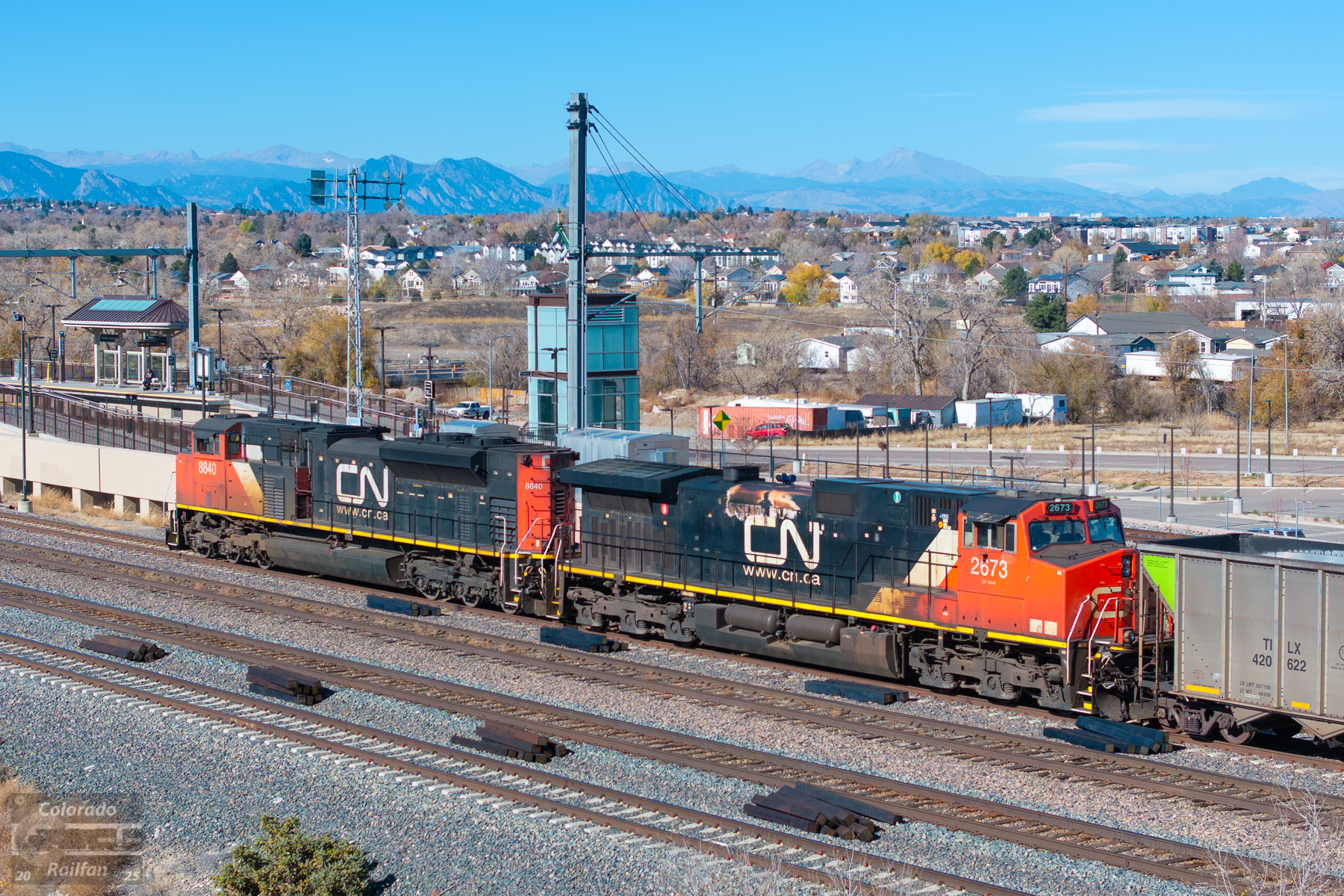 Not too often you can find not just one, but two Canadian National units in Colorado with Longs Peak as the backdrop! It is very interesting that a pair of DC-powered units (DC traction motors) are on a coal empty. These days, it is very rare to find anything other than AC units on coal trains, empty or loaded.