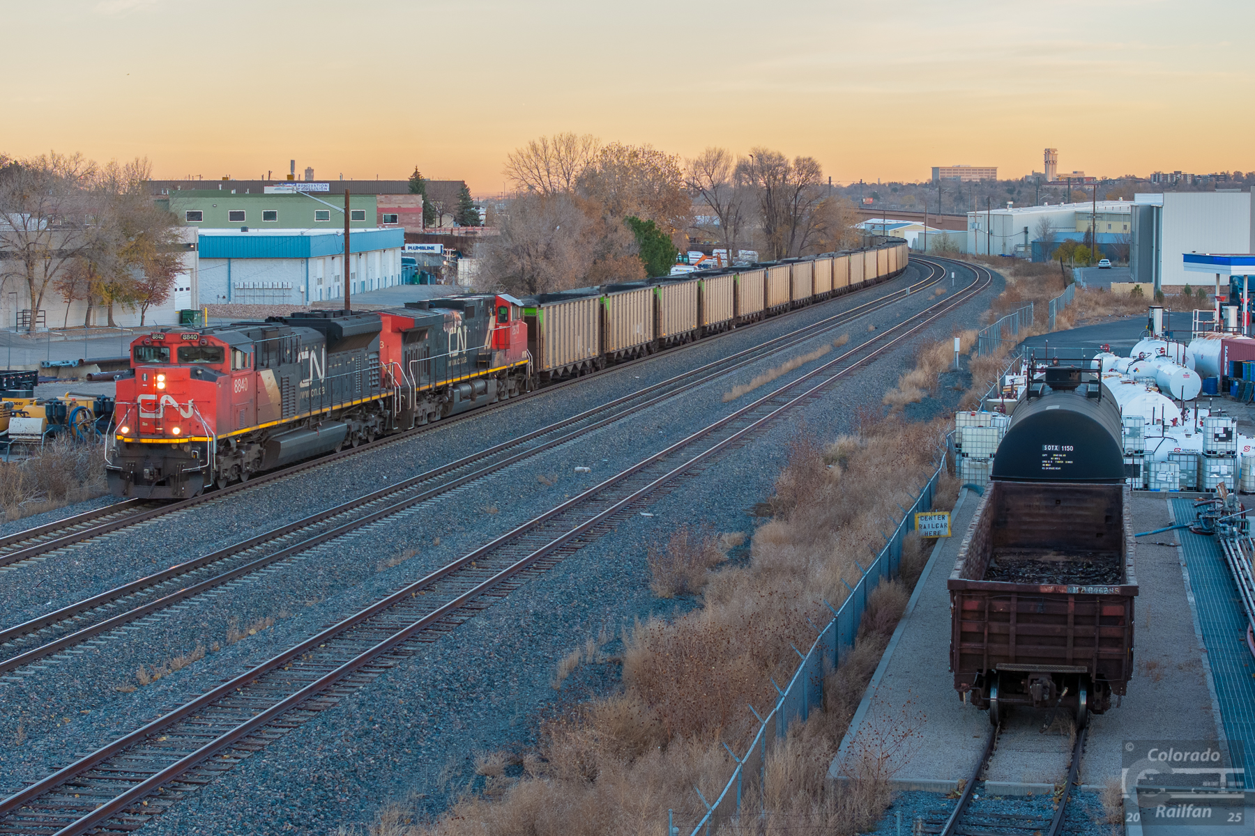 Welcome to mid-November! The sun has fully set behind the mountains here at 4:30pm as a westbound coal empty, with a pair of Canadian National units for power. The two cars to the right are at a local industry that has a lot of tanks that presumably hold petroleum products.