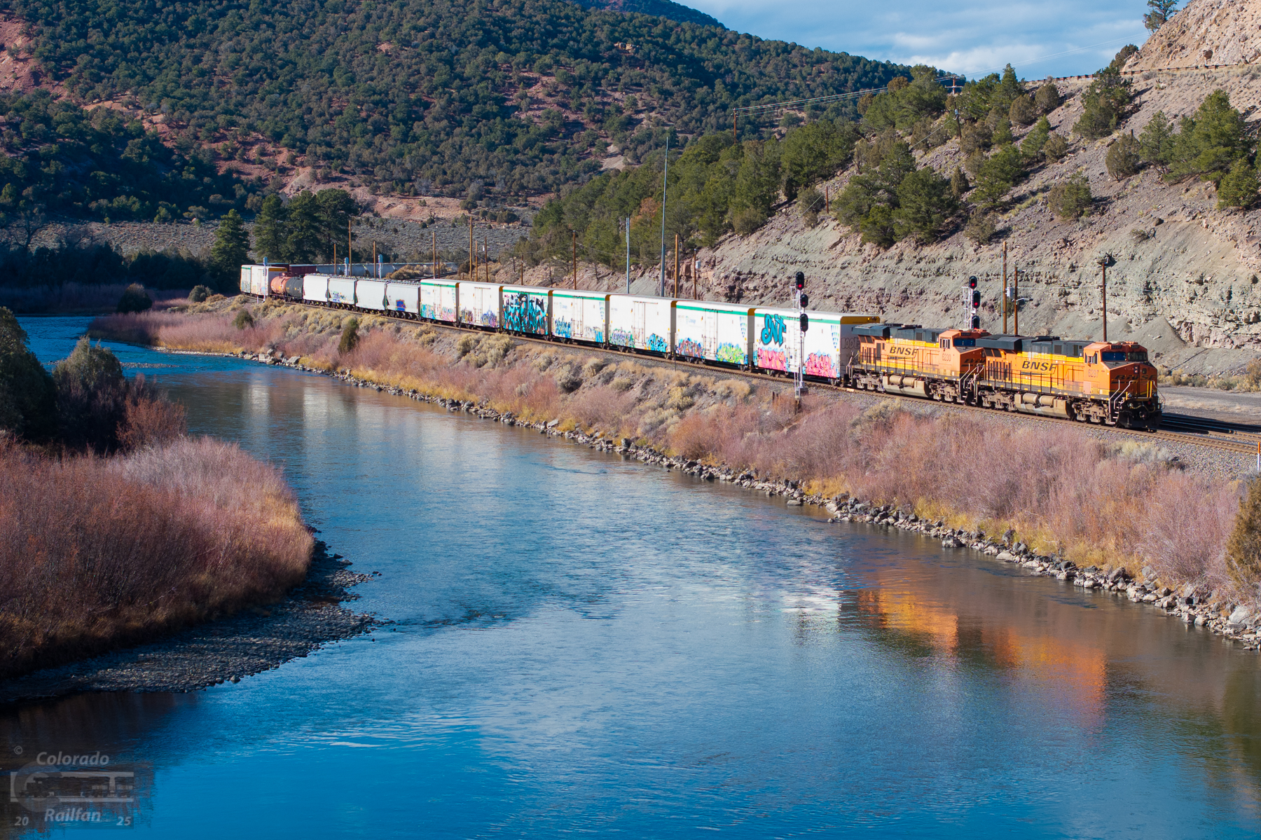 At the crossover at Center Bond, also known as Orestod, two ES44ACs bring up the tail end of a westbound Denver-Provo manifest. It is here at Orestod, which, incidentally, is Dotsero spelled backward, the Craig Branch leaving the mainline. 100 years ago, the Craig Branch was the mainline! It wasn't until the Dotsero Cutoff was built that everything changed, creating a direct route west through the Rockies between Denver and Salt Lake City.