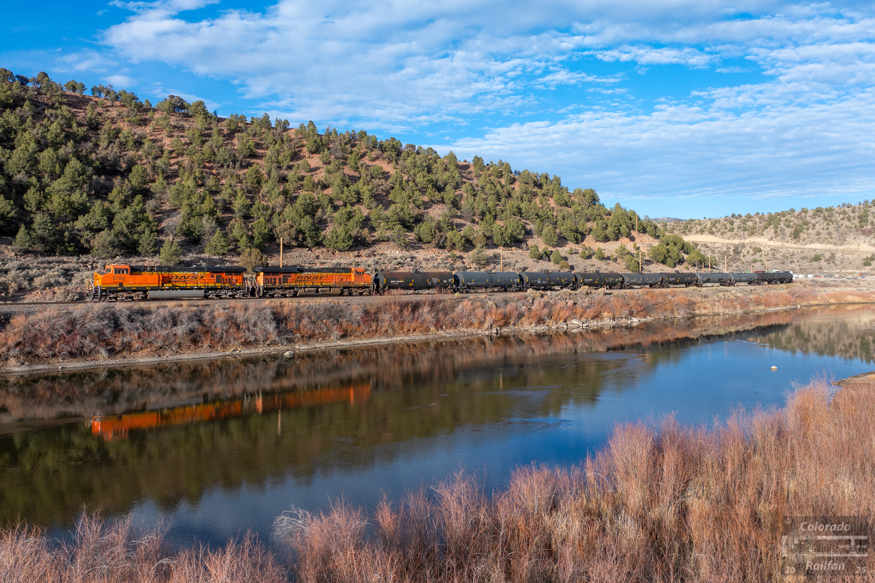BNSF typically runs their manifest on the Moffat in a 3x2 configuration. However, that standard has seemingly become less common lately. While there are two DPUs on the end of this eastbound, five units are on the head end. The train here is just east of Yarmony, following along the Colorado River.