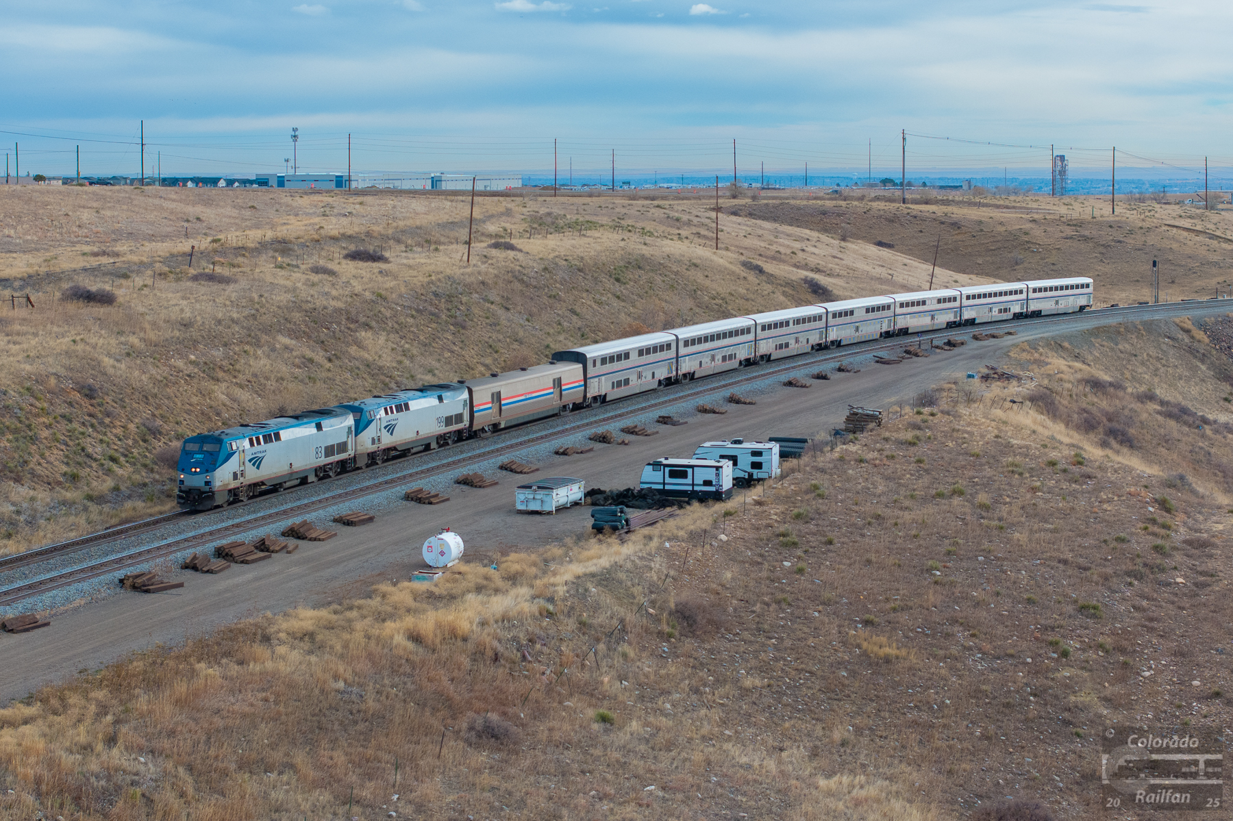The westbound Zephyr is running just a few minutes behind schedule after knocking down a green signal at the east end of Rocky. There are two diners and no lounge cars on the train today. Most likely, a few lounge cars are at Amtrak's repair shops in Beech Grove, IN, meaning there isn't one available for the Zephyr today.