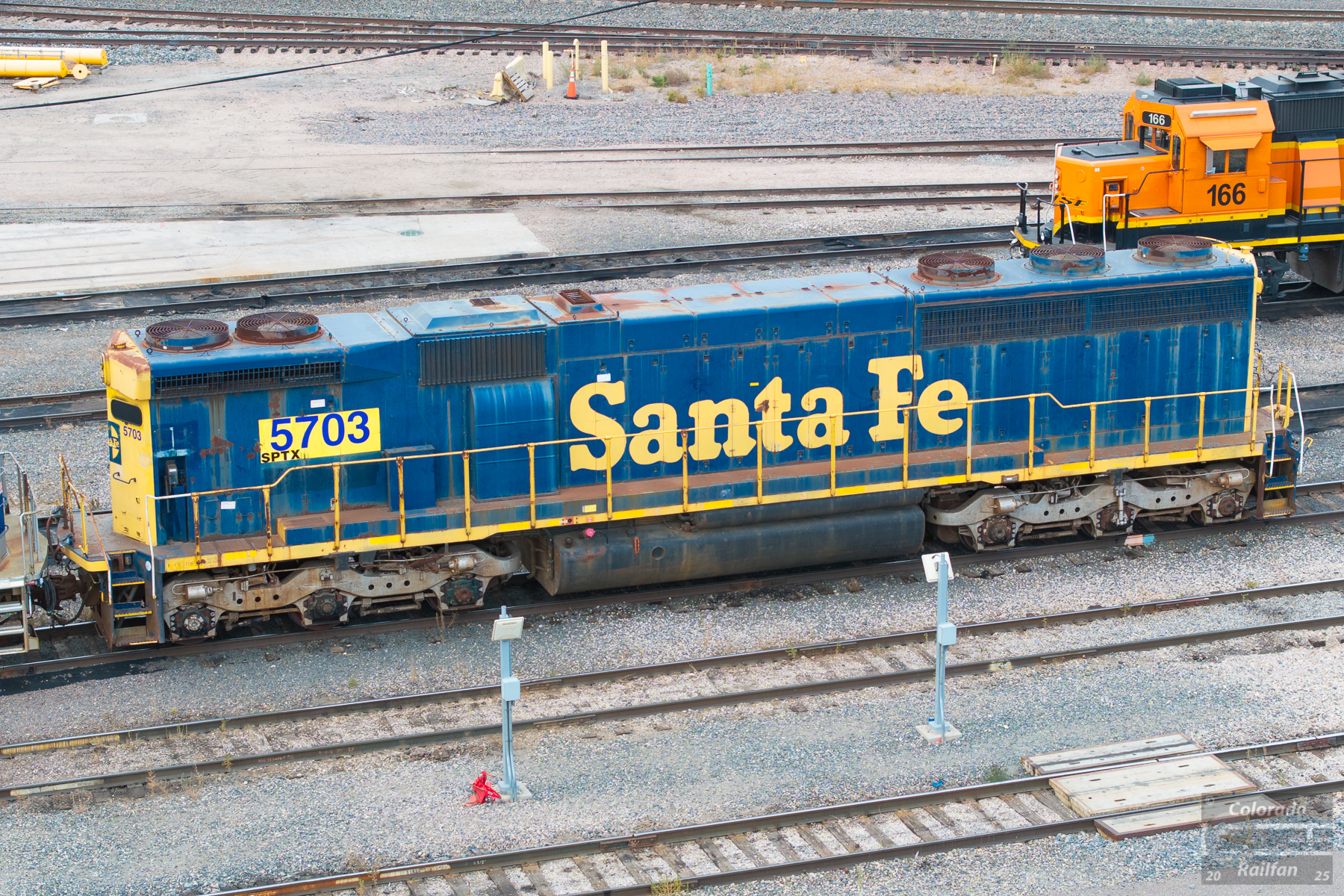 In the 1970s and 1980s, several railroads had a bit of a fad with B-units. Meaning units without a cab. The units still had a prime mover and traction motors, but could only be controlled when MU'd to other units. Such units are quite rare today, but it just so happened that an SD45-2B was coming through town at BNSF's Engine House today. SPTX 5703 has a bit of a storied history. It was actually originally delivered as a standard SD45-2 (with a cab). In fact, this was the unit that Santa Fe painted in red, white, and blue to celebrate the Bicentennial in 1976. However, in October 1987, Santa Fe converted three SD45-2s into B-units, removing their cabs. ATSF 5703 was one such unit. Note that the dynamic brakes were moved forward to the area where the cab had once been located to help improve cooling. The unit is now owned by a private individual named Noah McCann, and it is reportedly headed to Middletown, IA.