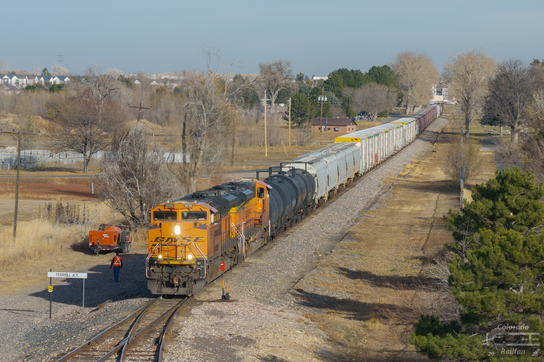 At Terrell Junction on the BNSF Golden Sub, BNSF's afternoon "Beer Run" has nearly completed the 12-ish mile trip from the 31st Street Yard out to Coors Lower Yard in Golden. Here at Terrell Junction, the diverging route goes to the lower yard, while the non-diverging route goes to the upper yard. The conductors just threw the switch and is walking back to check sometime further back on the train.