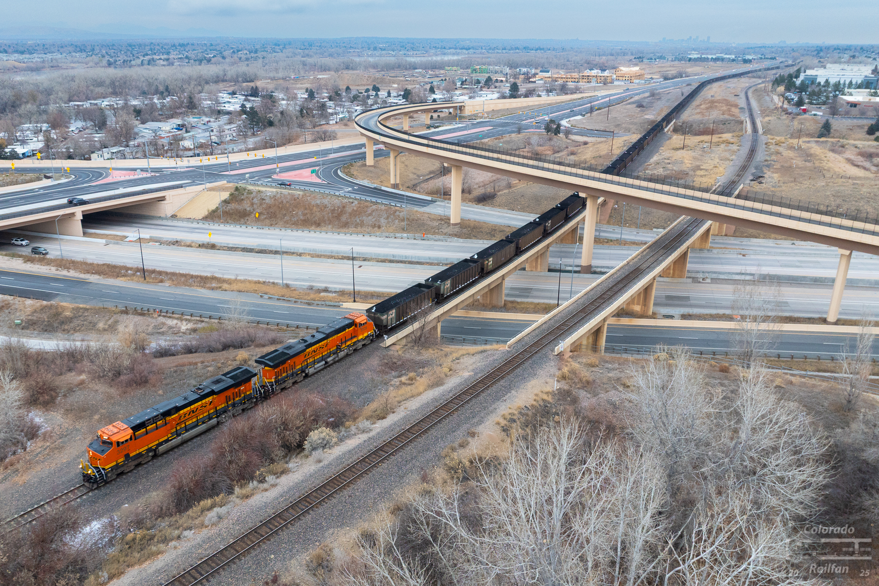 This southbound coal load is passing over the C-470 freeway and underneath the relatively new onramp from southbound US-85 onto eastbound C-470. The train is on Main 1, owned here by Union Pacific, and dispatched by BNSF.