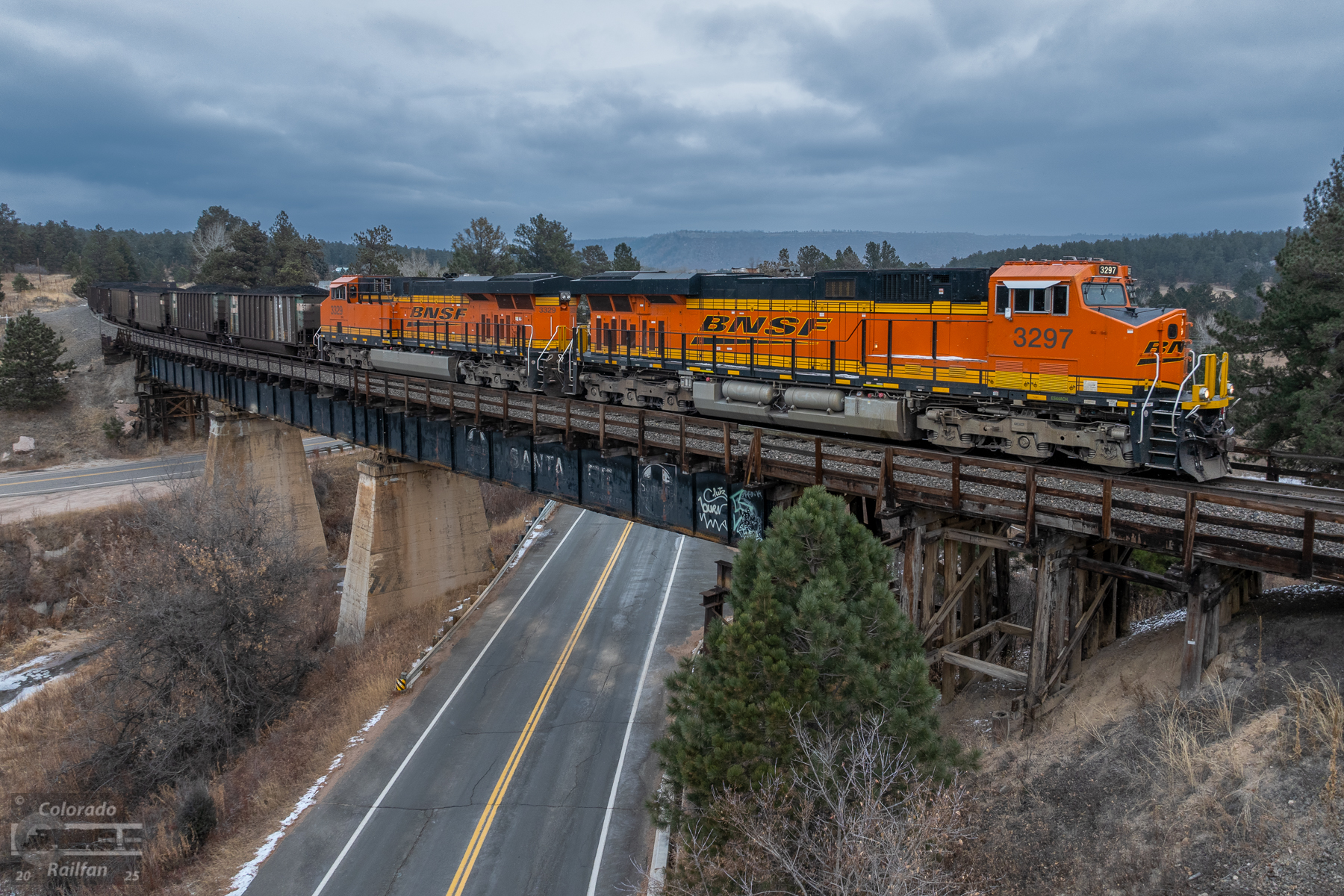 There might be no location on the Joint Line as recognizable as the old Santa Fe bridge on the south side of Larkspur! Two shiny ES44ACHs lead a southbound coal train across the bridge, which still sports a (highly faded) Santa Fe herald and lettering.