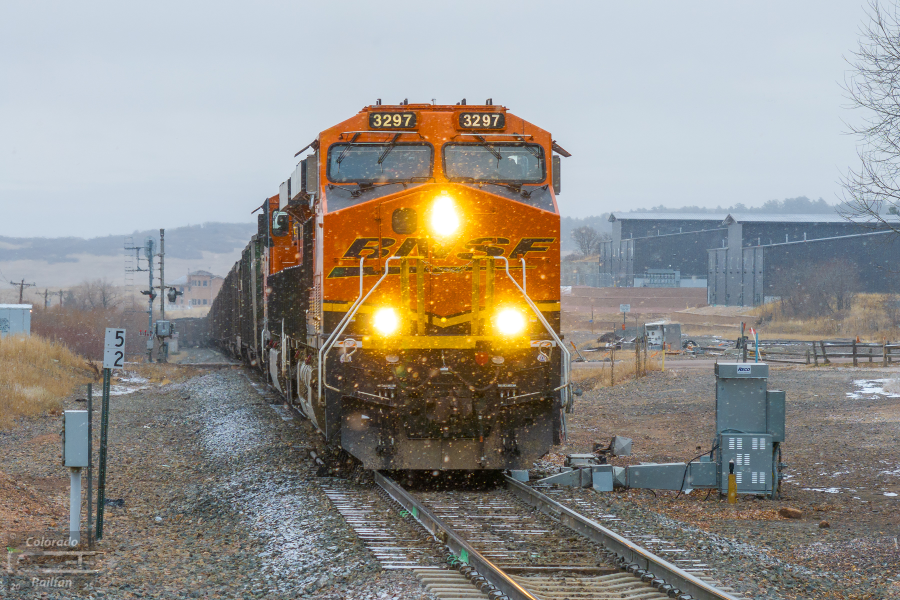 Single track ahead! At Palmer Lake, two tracks come to an end and there is now a single track main for the next 32 miles. Snow is falling at a decent click here roughly 7,200 feet above sea level as a southbound coal load comes through the OS of Palmer Lake, right at MP 52.