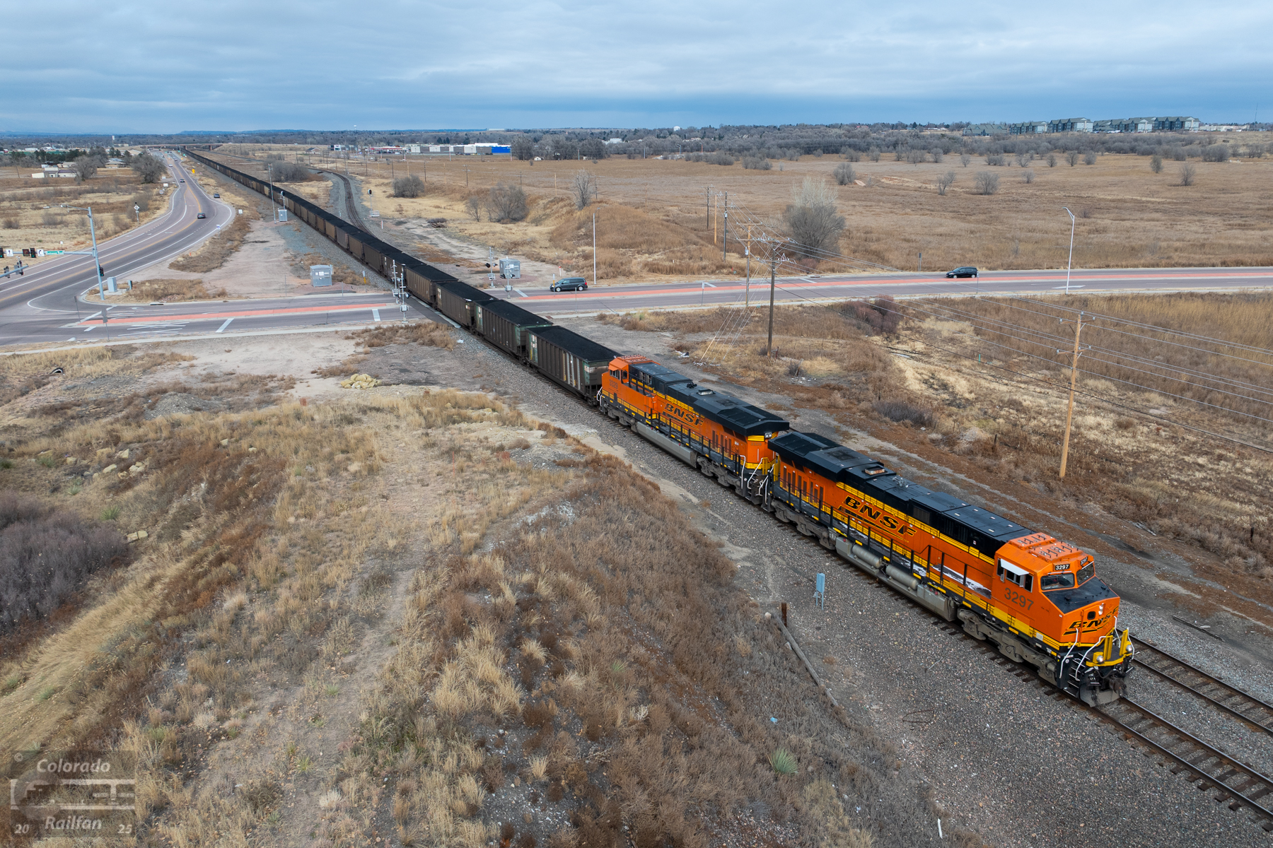 South of Colorado Springs, in the small town of Fountain, CO, the single track main end and two tracks continue south the rest of the way to Bragdon. A southbound coal load crosses Duckwood Road on Main 1. It was once here that the Santa Fe main crossed over the Rio Grande main prior to the Joint Line being operated as the Joint Line. You can still see evidence of the dirt embankment on either side of the tracks where the Santa Fe tracks existed over 100 years ago.