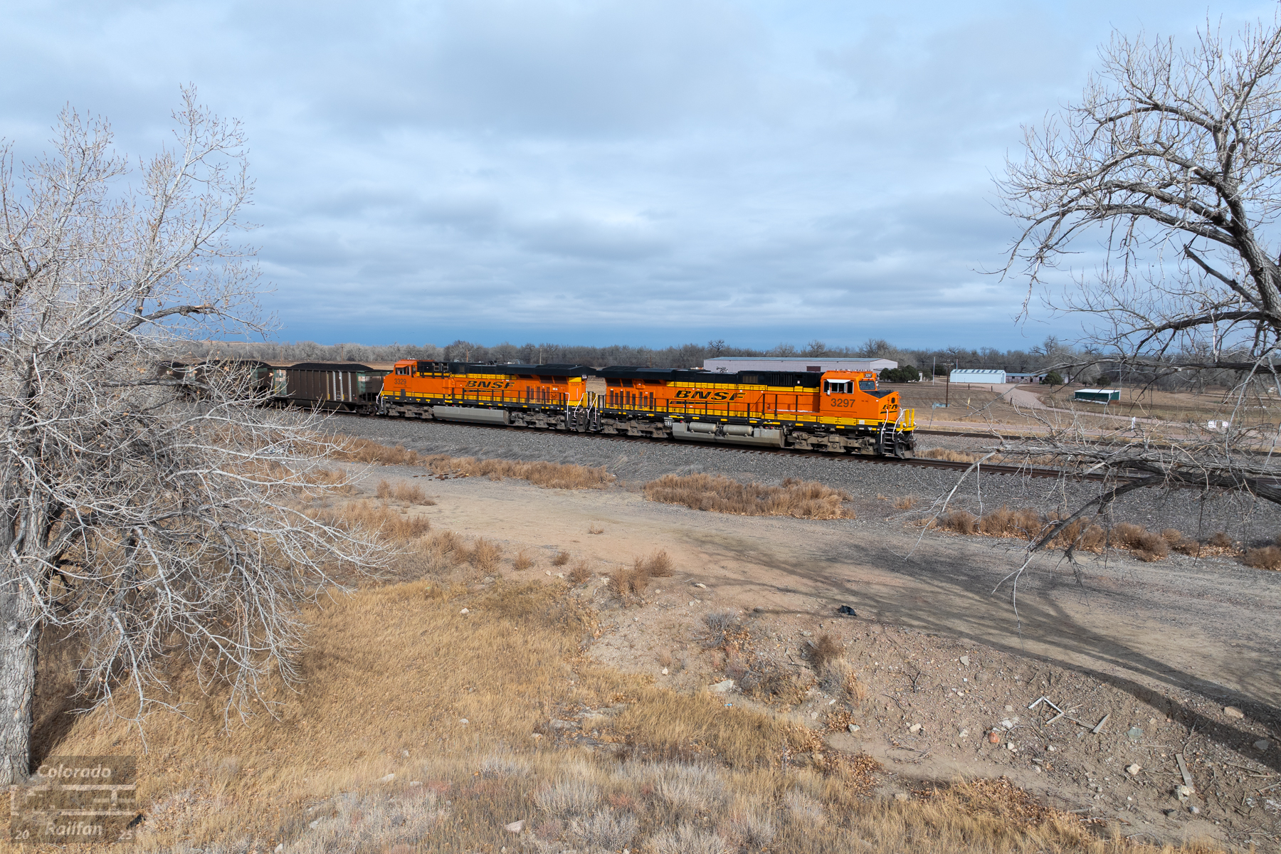 Just north of the Hidden Valley Road grade crossing near the Nixon Power Plant, we catch a little bit of sun lighting up two fairly new ES44ACHs (or ES44AHs) on a southbound BNSF coal load. BNSF 3297 was delivered in September 2023 and BNSF 3329 was delivered in 2024. Both are Tier 4 credit units, part of a 50-unit order from GE (Wabtec).