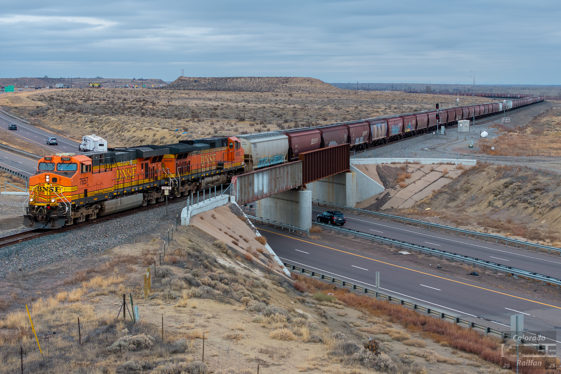 On Sunday, October 15, 2023, the east half of this bridge carrying BNSF's Pikes Peak Sub over I-25 collapsed due to a broken rail. A loaded coal train derailed as a result of the broken rail, striking the bridge support. The highway was closed for four days for cleanup and repairs. BNSF trains ran on UP's mainline further to the east during the closure. Over two years later, a loaded grain train headed for Barstow, CA crosses over the bridge and I-25 on its way south toward Pueblo and points beyond.