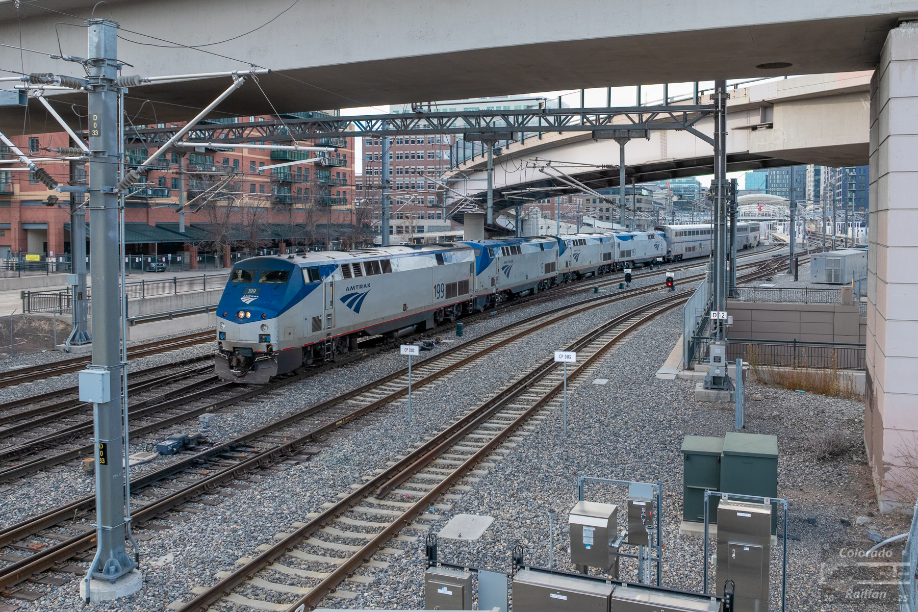 This morning, the westbound California Zephyr showed up in Denver with equipment for the Winter Park Express! The train backed into Track 4 and dropped off the passenger cars (and baggage car) of the Zephyr. Here, the first two P42DCs are the power for the Zephyr. The second two and the five Superliners behind are the Winter Park Express. The Winter Park Express will be set out on Track 5.