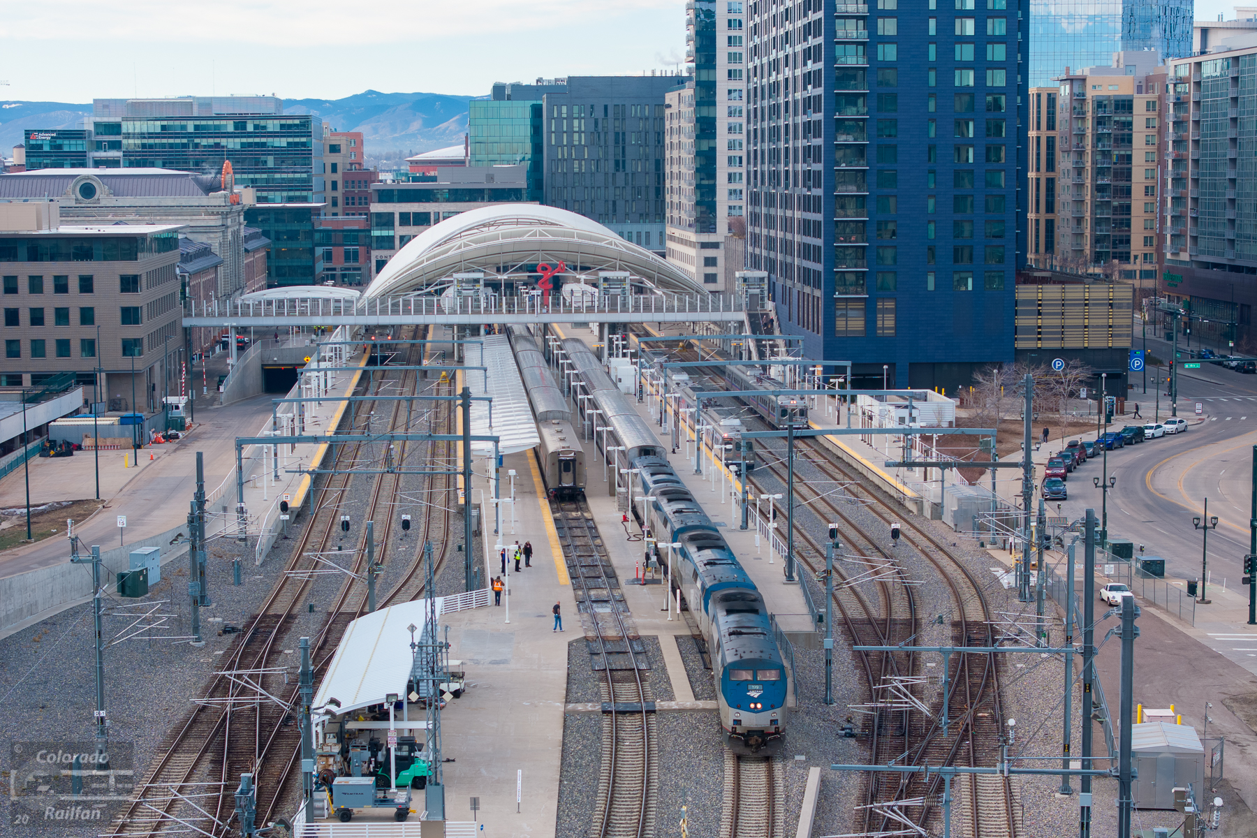 A few Amtrak crew members watch as the Winter Park Express equipment is set out on Track 5. The train will start running on December 19th with five Superliners (four coaches with a lounge car in the middle). In January, two more coaches will be added to the train. You can see the westbound Zephyr sitting on Track 4 to the left. After positioning the Winter Park Express on Track 5, the two lead P42DCs will move back over to Track 4 to pick up the Zephyr for the trip west to California.