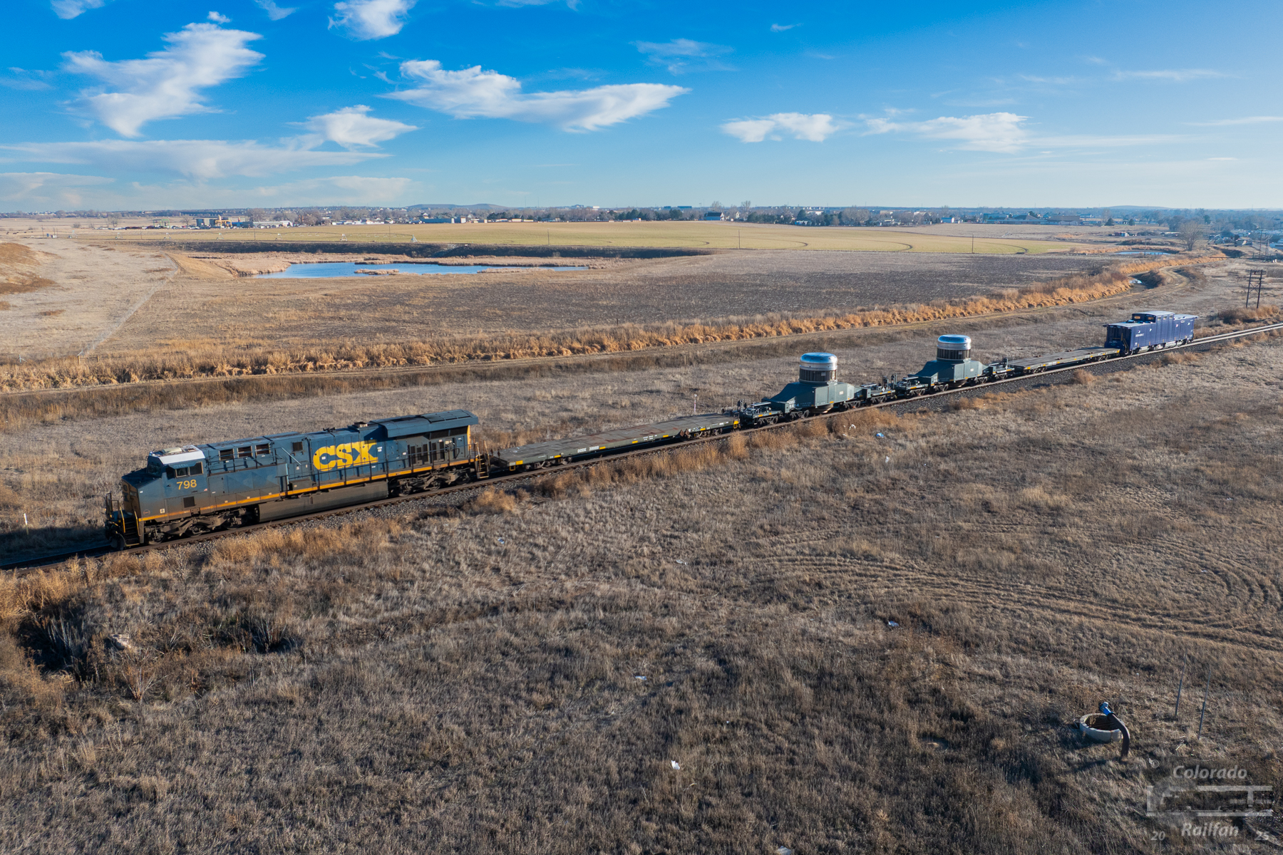 Just south of the E-470 overpass, a sole CSX ES44AH leads a special train north on the Greeley Sub. The two curious looking cars on this train are carrying radioactive nuclear material. The casks allow the material to be safely transported by rail.