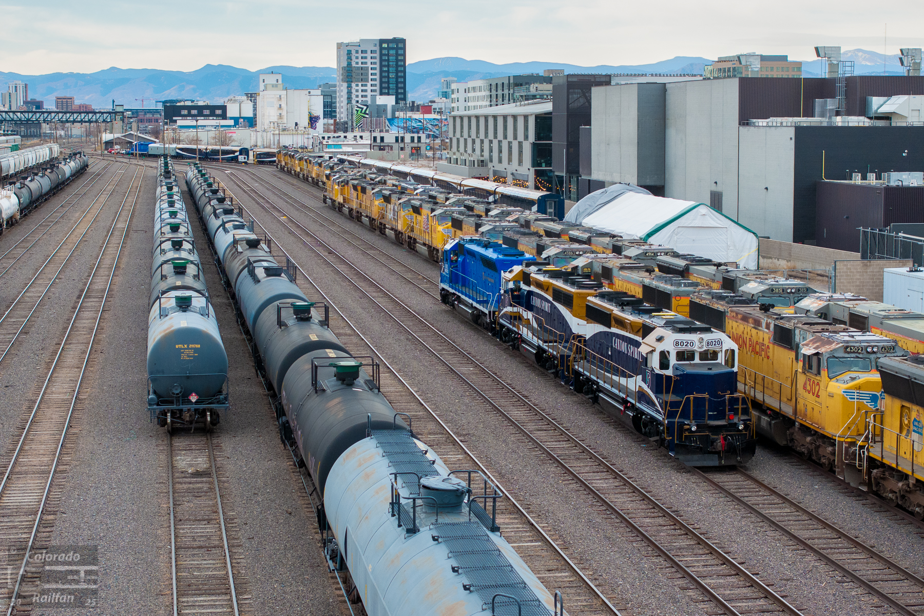 The Rocky Mountaineer's SD40M-2 pulls the newly lettered GP40-3s as the Canyon Spirit through the yard at 36th Street. You can see the Mountaineer cars in the distance on the track they lease from Union Pacific.