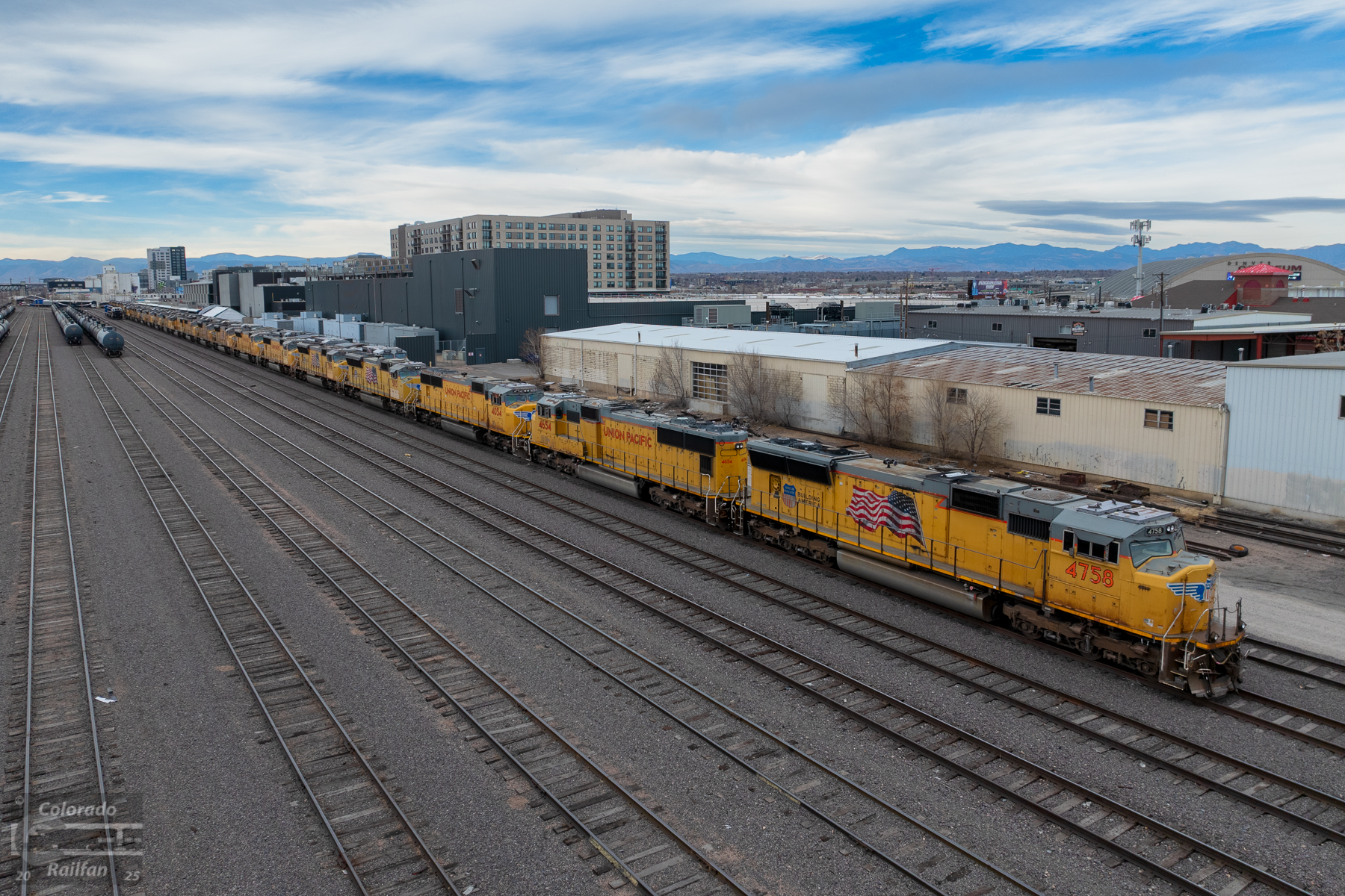 Like most Class 1 railroads today, Union Pacific has a lot of older units in long term storage. Many of them, including dozens of SD70Ms, are currently stored at 36th Street Yard in Denver. The units are waiting for one of three things. To just be reactivated and put back in service, to be rebuilt and put back in service, or be sold. Until one of those three things happens, here they will sit quietly and wait.
