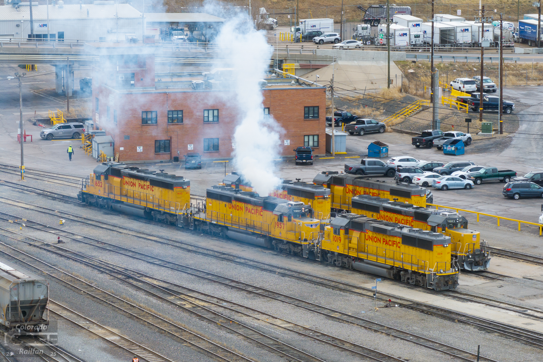 A UP yard crewman just started up the prime mover in SD40-2 #1957. It is taking several minutes for the unit to fully warm up and, as a result, a lot of white exhaust is currently being produced. Also of note in this shot in UP 1019, a GP60. For whatever reason, UP seems to utilize GP60s in California and Texas quite a bit. They don't show up in Colorado all that often.