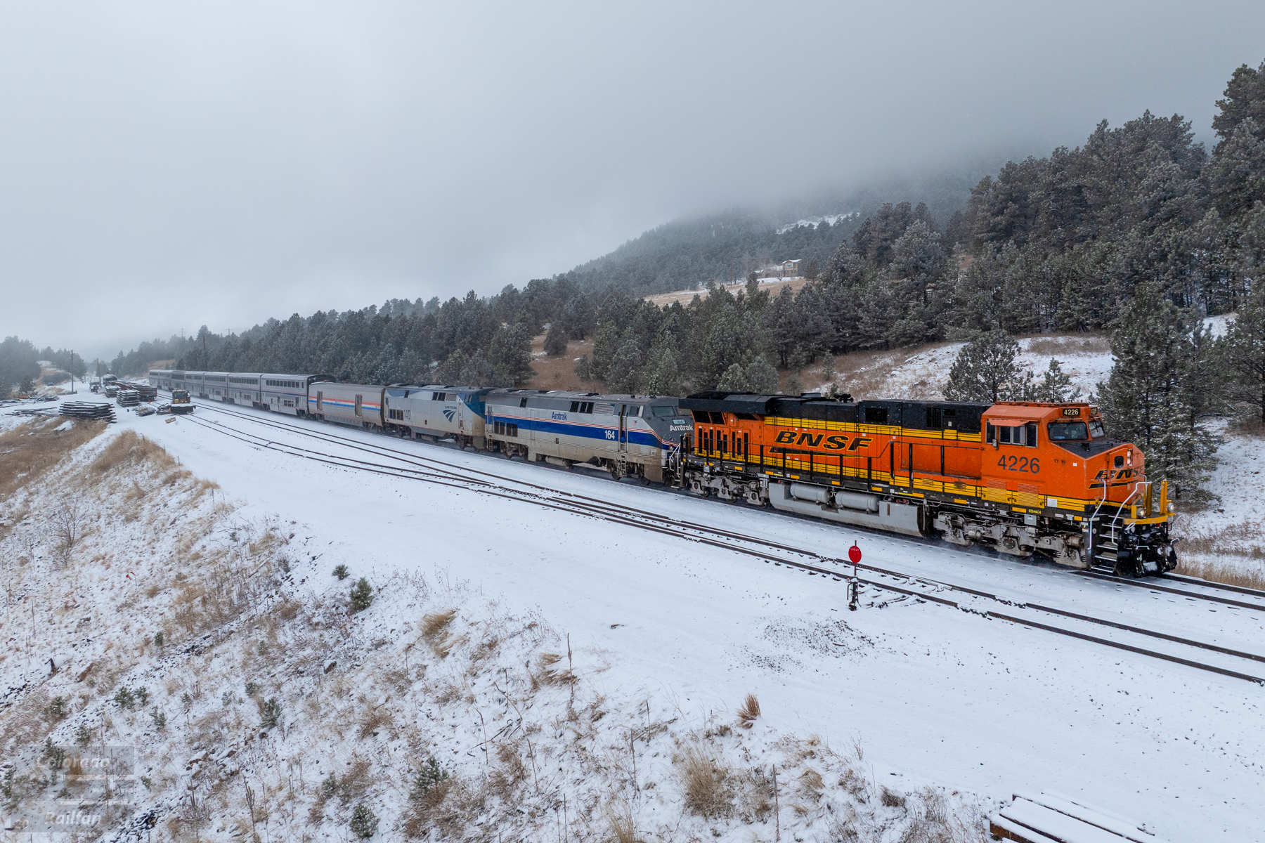 The westbound Zephyr has a very colorful consist this morning, with a BNSF ES44C4 on the point, and AMTK 164, the Phase 4 heritage unit, second out. The BNSF unit was added to the train in Lincoln, NE overnight due to a mechanical issue with one of the P42s. I am not sure which one or what the issue was. The train is on the main at Plain, passing by the house track on the approach to Rainbow Cut.