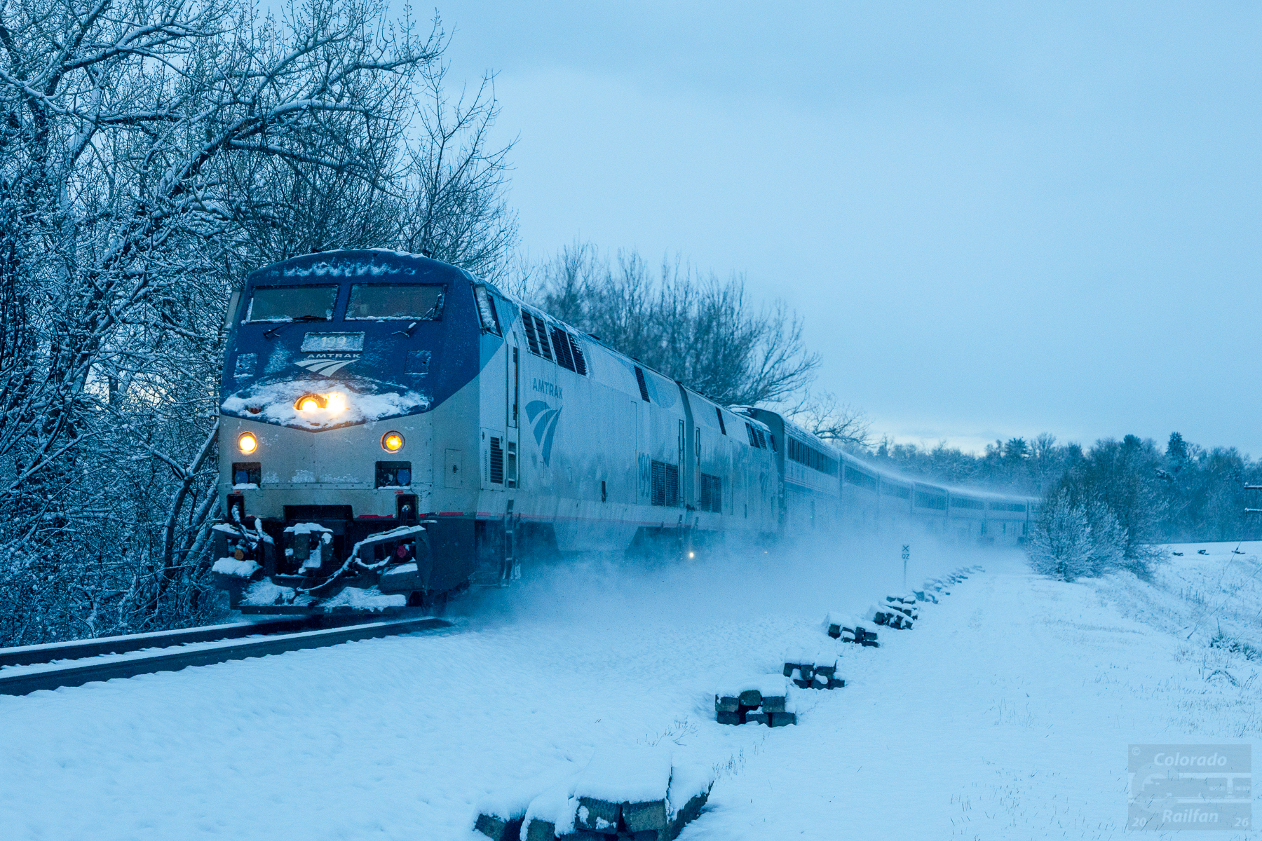 The Front Range finally received a decent amount of snow overnight, no doubt making the passengers on this morning's Winter Park Express happy. The train kicks up some snow, blowing alongside the Superliners, as it heads west on time just east of the Kipling Street grade crossing in Arvada.