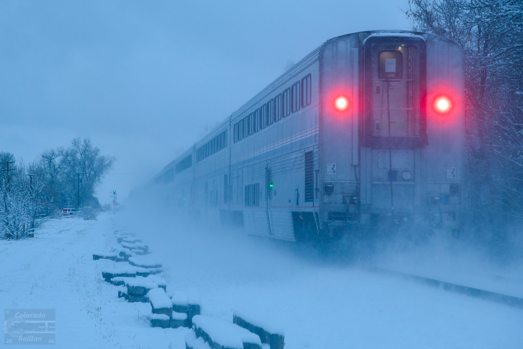 Running right on time, this morning Winter Park Express approaches a green intermediate signal at Kipling Street, kicking up a flurry of snow as it heads west at track speed.