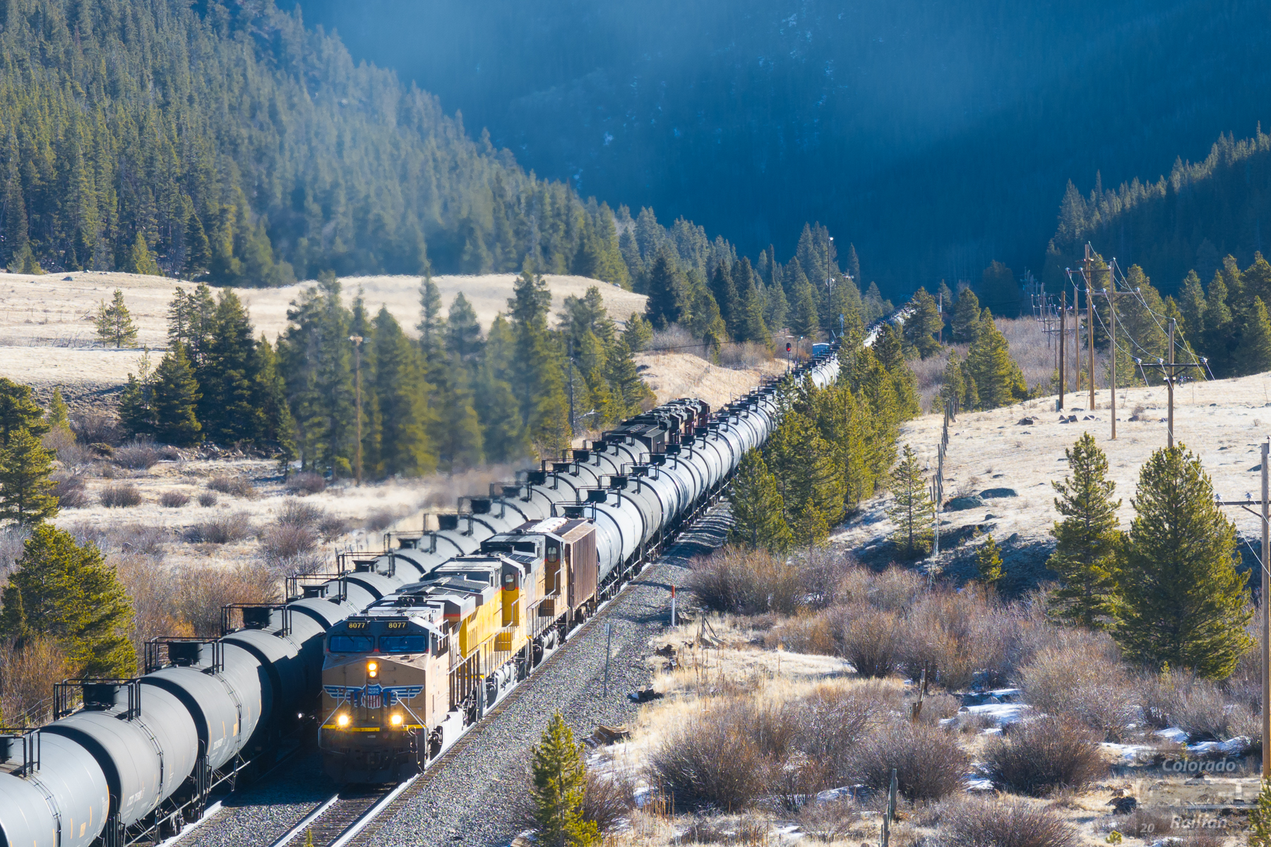 A westbound Union Pacific empty oil train heads west on the main at Tolland, meeting an eastbound BNSF loaded oil train that is waiting in the siding. The Winter Park Express ran around the UP oil train at Cliff. After meeting a coal load at Cliff, it was the oil trains turn to continue west.