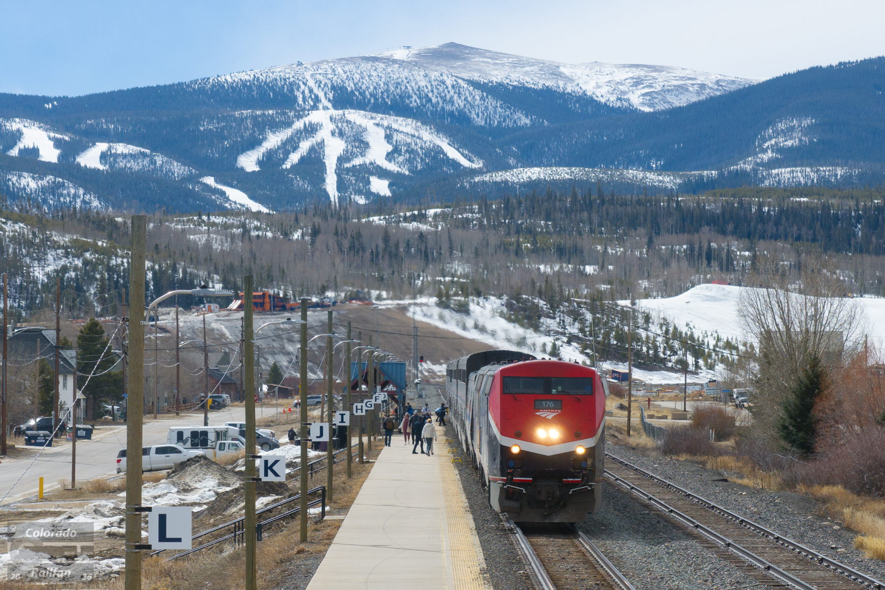 The westbound California Zephyr is at its station stop at Fraser, just about 10 minutes behind schedule. Fraser is a "fresh air" stop for the Zephyr. The train is usually stopped for right around 10 minutes here. Passengers can step off the train for some fresh mountain air, or to get a smoke break (if that's your thing).