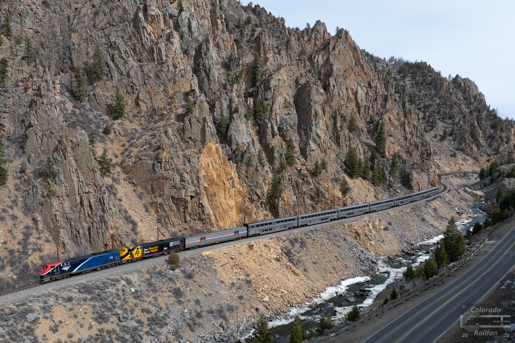 As the westbound Zephyr rolls along in Byers canyon, we can see the Colorado River at the bottom of the canyon. This is close the start of the Colorado River, which will continue to flow all the way to the Gulf of California. In this shot, note that a fairly significant section of rock face gave way and fell down to the river below. The rocks being much brighter shade of orange, having not been exposed to the elements until relatively recently.