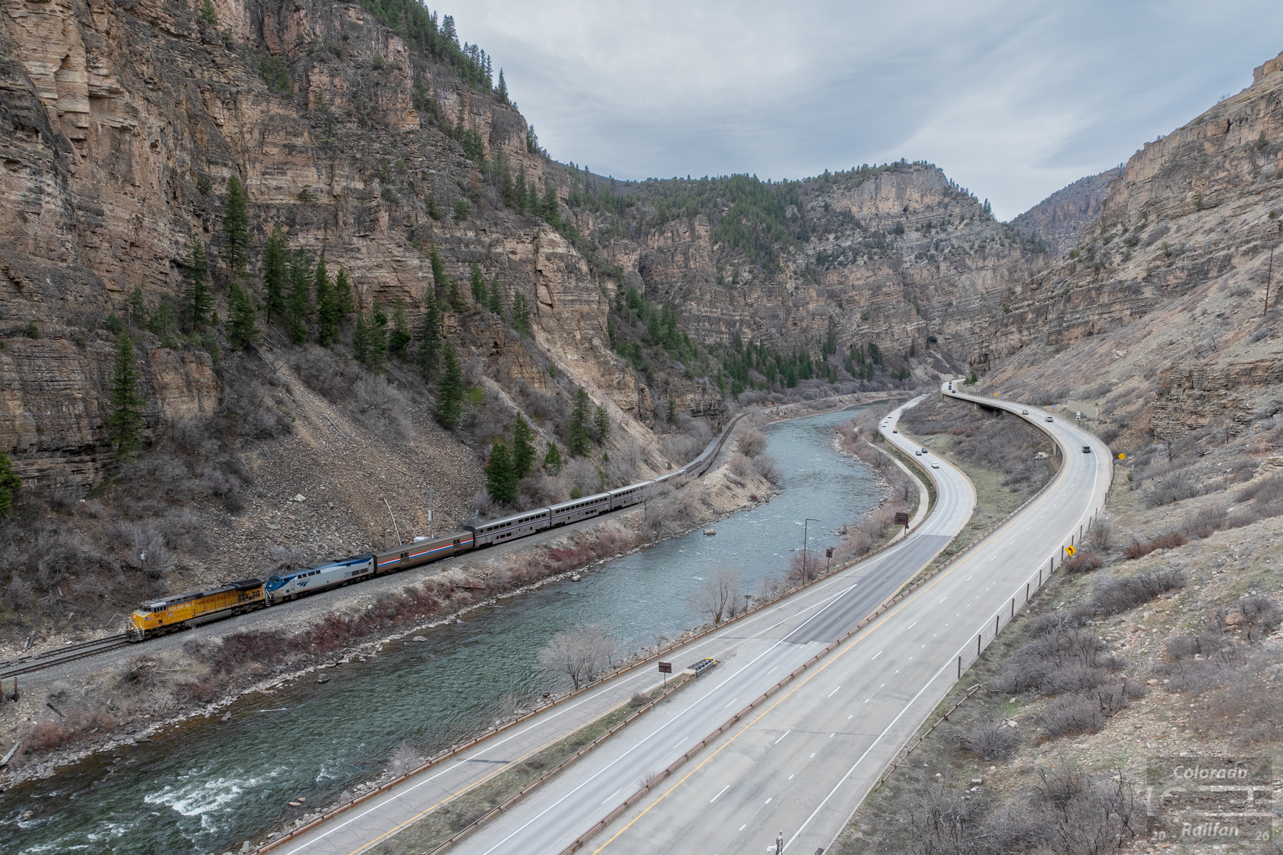 A bit of a surprise on the eastbound Zephyr as a UP C44ACM leads AMTK 201 on the journey east through Glenwood Canyon at the west switch of Grizzly. The original Amtrak P42DC was removed in Salt Lake City and the UP unit was added, likely due to mechanical issues.