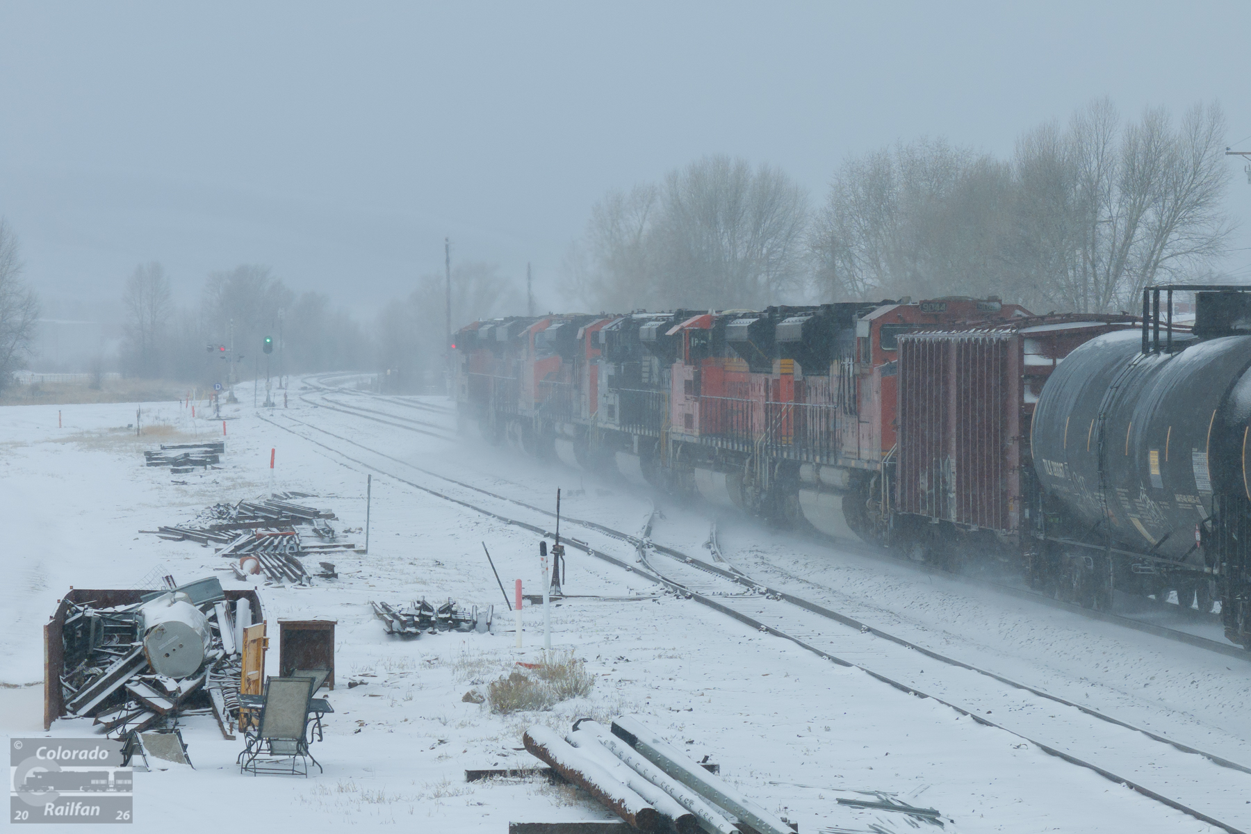 A green signal at the west end of Granby lets the crew on this BNSF oil train know that they are clear to leave the siding and re-enter the single track main west of Granby. It is a very cold (roughly 12°F) morning with a lot of snow being kicked up.