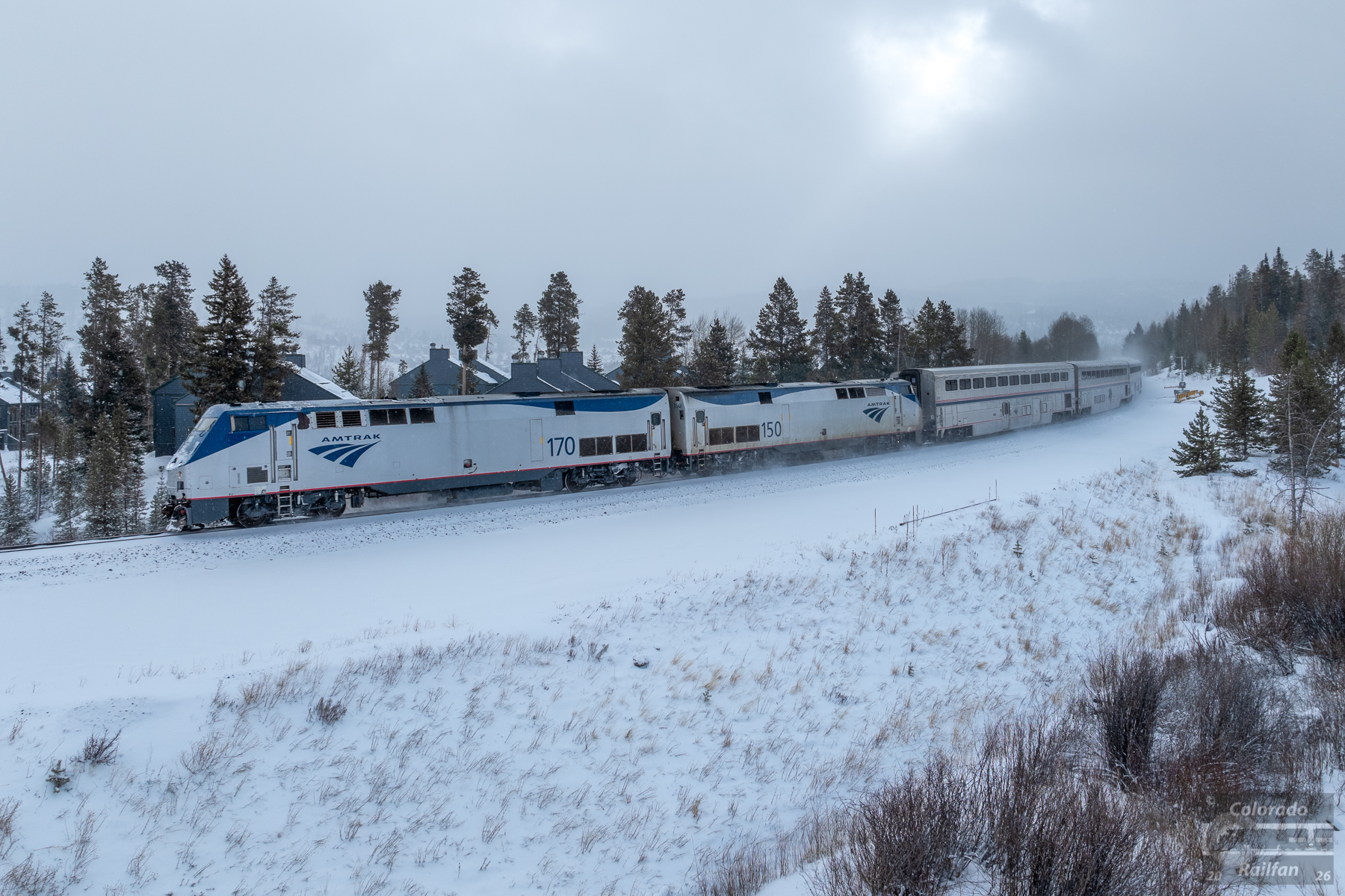 AMTK 170 and AMTK 150 have had the responsibility of running the Winter Park Express for the last several weeks. More often than note, one or both P42DCs on the Winter Park Express will be changed out at least once or twice over the course of the ski season. This is usually due to required maintenance. Here, the pair bring the Winter Park Express along Kings Crossing Road on the west side of Winter Park.