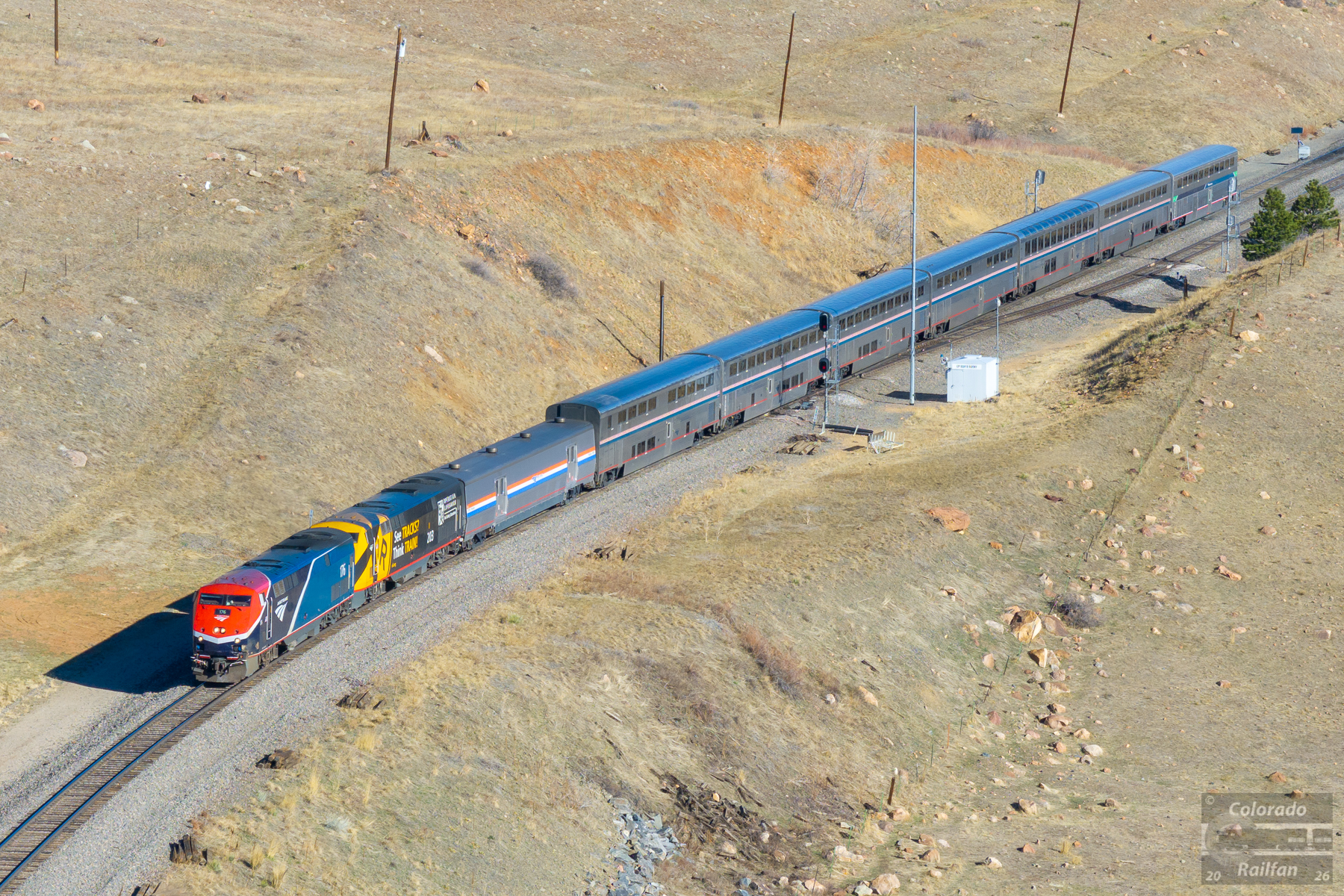 Kevin’s great photograph captures AMTRAK #5 heading almost exactly due south and entering the longest curve on the Atlantic side of the Moffat Road. Westbound from the middle of the east/west alignment portion of the Rocky siding, the Moffat Road is on its steady, continuous 2.00% grade, compensated for curvature until it reaches the slack grade designed into the Plainview siding. This 3,045.2 foot long, three radius compound left curve is the first and lower of the two curves between the Little Ten horseshoe curve and the Big Ten muleshoe curve. This unique curve contains a 3° segment, followed by a short 1° segment, followed by an 8° curve. It has three spirals – one at each end and one combining spiral at the transition between the middle 1° segment and the higher 8° segment. The curve climbs 52.65 feet from beginning to end. This is one example of the complex location engineering done by Robert Edward Cowden in December, 1902 for Chief Engineer Horace A. Sumner to ‘wiggle’ the line into the existing terrain’s most economical location to construct and operate.