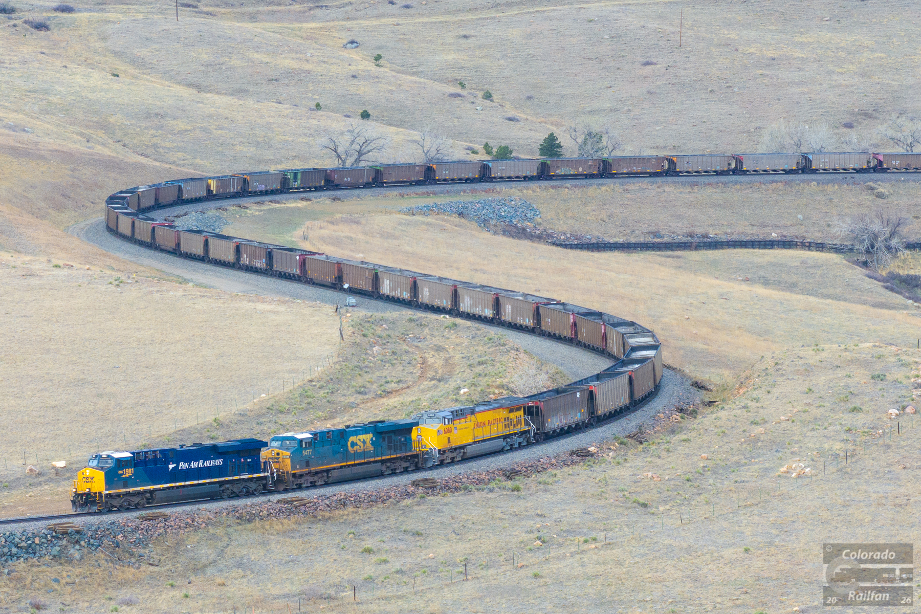 A trio of elephant-style GEs, including CSX 1981 (on the point), lead the longest train on the Moffat that I've ever personally seen. The train is 11,500 feet long! Basically, two coal trains combined into one. 209 cars, three units on the point, three mid-train swing helpers.