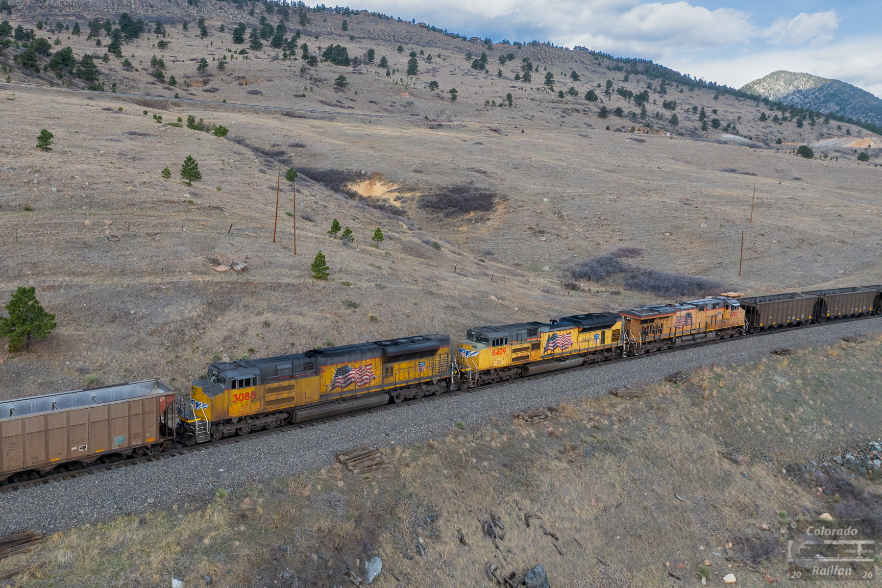Three mid-train swing helpers, including a Tier-4 SD70ACe-T4, are roughly 105 cars deep in a 209 car coal empty that is making its way west to Grand Junction. The train is basically two coal trains combined, and they will split in Grand Junction, running to the mine at West Elk individually.