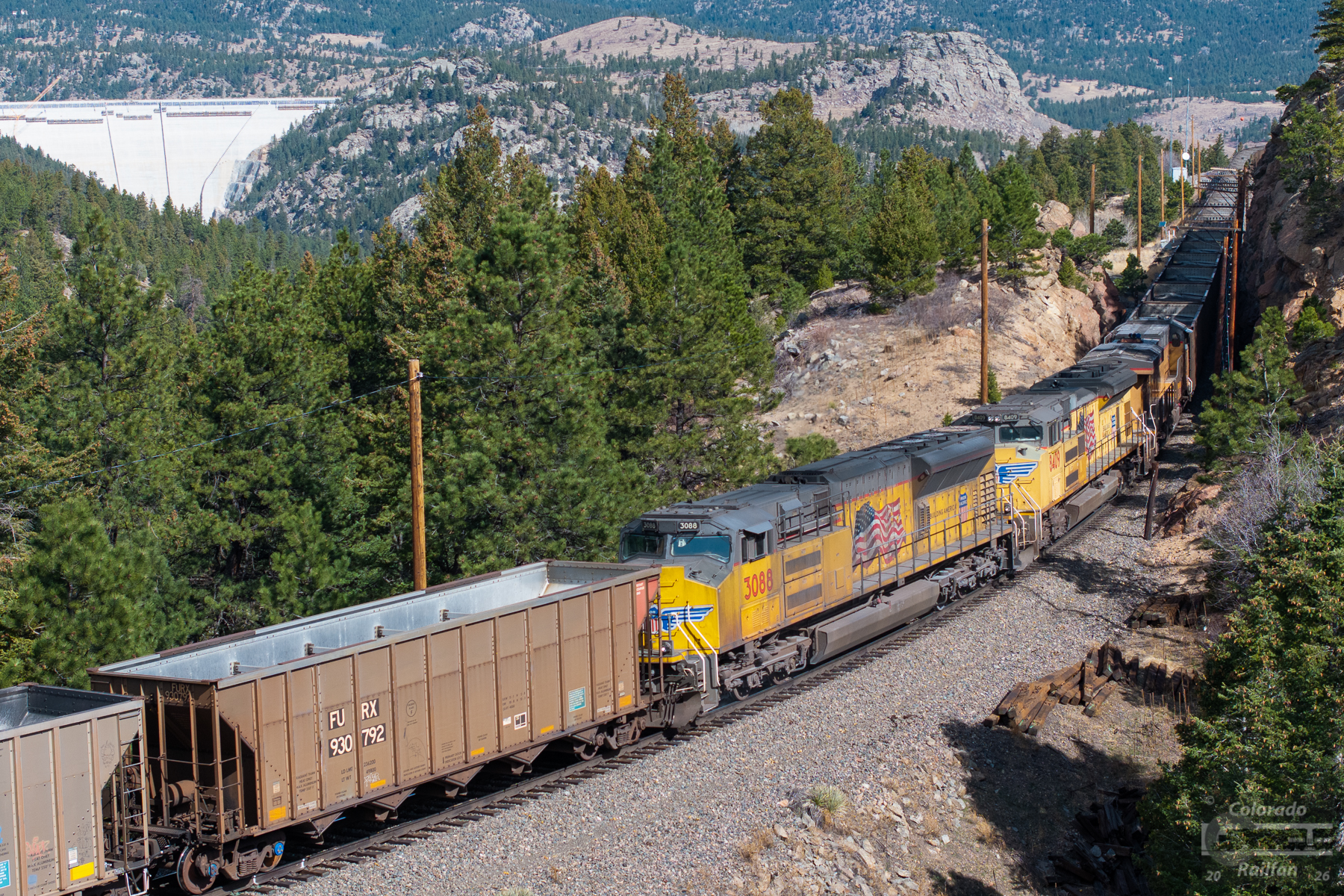 A trio of UP units represent the halfway point on this monster coal empty. The train is 209 cars long, and is 11,500 feet long. Even though this is the halfway point of the train, over a mile of the train has already passed by.