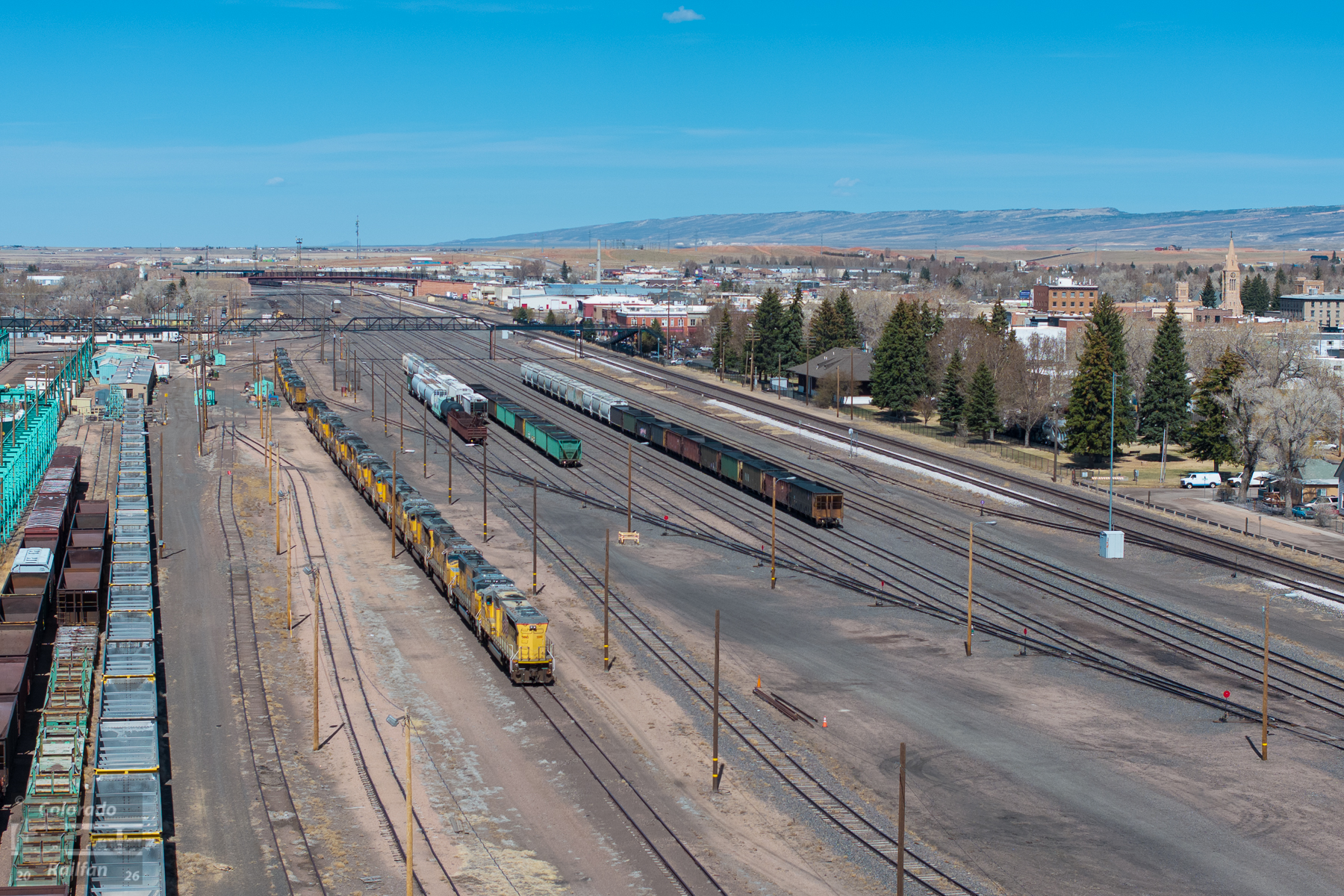As you may be aware, Union Pacific has a lot of locomotives stored all throughout its system right now. Laramie, WY is no exception, as there are nearly two dozen SD70Ms in storage here.