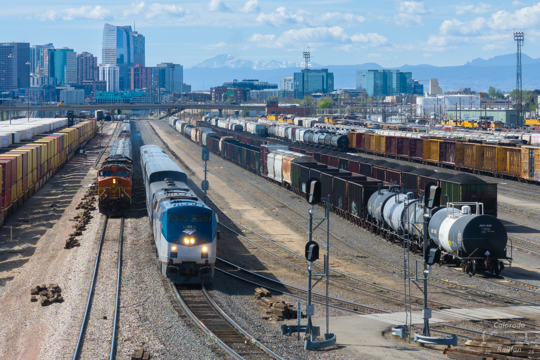 The westbound Zephyr got trapped in Union Station this morning by BNSF's Denver-Laurel manifest. The manifest was working on pulling out of the yard, but the air test and DPU linking took longer than expected, and the Buck Lead was blocked by the manifest. Once the manifest cleared, the Zephyr could depart. In this shot, the BNSF Denver-Laurel is to the left of the Zephyr. The Zephyr is now on the Moffat main, the only track under CTC jurisdiction in this shot, as it passes by CP DS002.