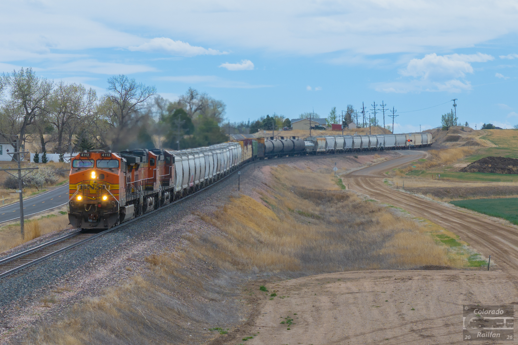 Clouds have really started move in this afternoon as this BNSF's Denver-Laurel heads north of Longs Peaks toward the town of Berthoud (and points beyond). The train is making good time, and shouldn't have to stop again until reaching BNSF's North Yard in Fort Collins. There, it will drop some cars for the Great Western Railways, and likely pick up others.