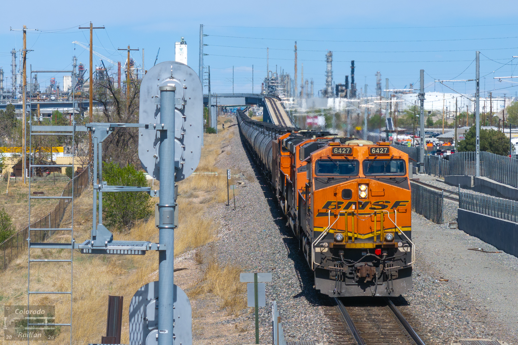 This westbound BNSF oil empty is approaching the signal at BNSF's Fox Junction on the Brush Sub. This train will ultimately head west on the Moffat for loading in Utah, but the power will first swap out in Denver. BNSF's Brush Sub dispatcher has informed the train that they will tie down on the track named "Coal 2", leaving room for six units on the head end. They have also been instructed to take the three units currently on the train to "the pit", meaning the fueling tracks, for servicing.