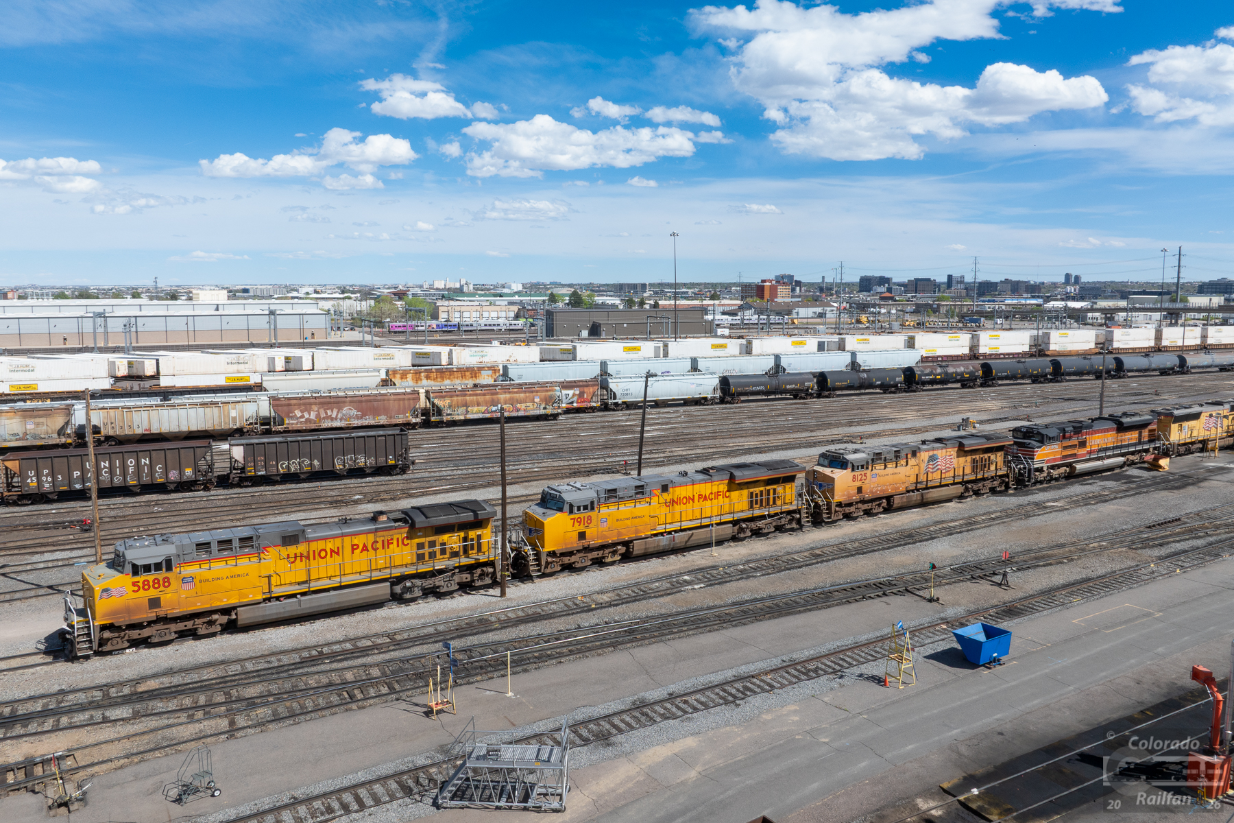 Power for UP's MNYCY (Manifest, North Yard, CO to Cheyenne Yard, WY) is all lined up with four units elephant-style. The fourth being UP 1996, the Espee Heritage Unit. There is a string of SD70Ms also coupled behind UP 1996, but they will definitely all be deadheading to Cheyenne when the train departs later tonight.
