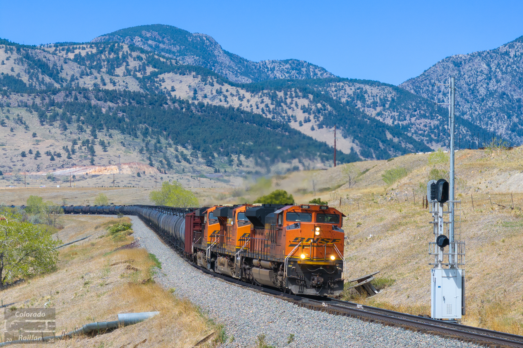 In typical BNSF oil train fashion, a trio of unit lead an eastbound in Barbara's Gulch on the approach to a green intermediate signal at MP 16.1. The train met a Denver-Provo at Rocky, and will now get green signals the rest of the way in to Denver.