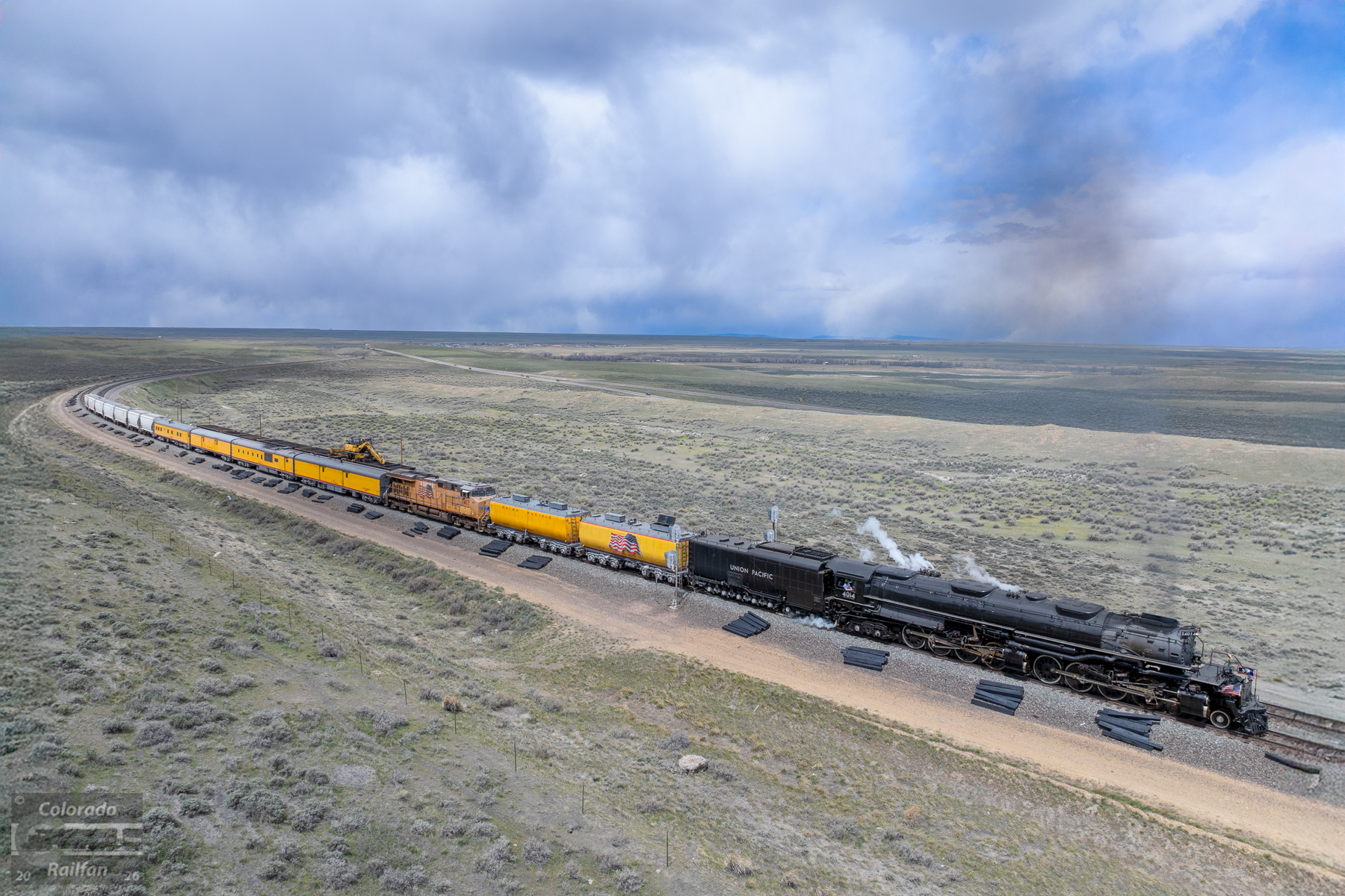 Some nice light broke through for what of the better shots of the day as UP 4014 and train pass through the OS at CP W601 on Main 2, passing by a short MOW crew that is working on Main 1. The tiny town just barely visible in the distance in Rock River, WY, with a population of 211.